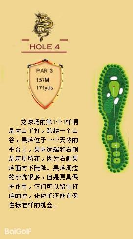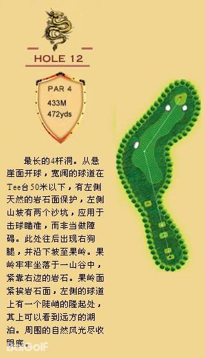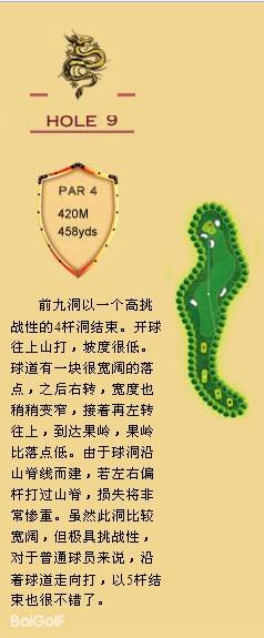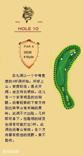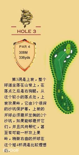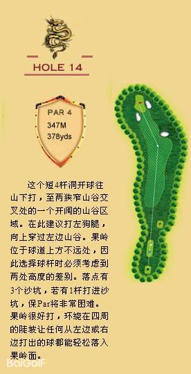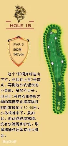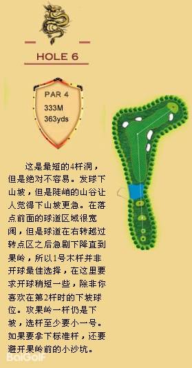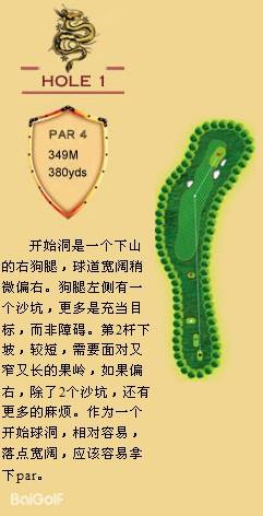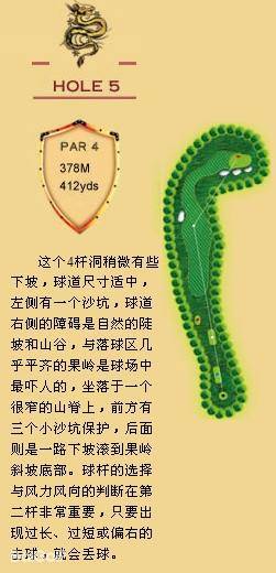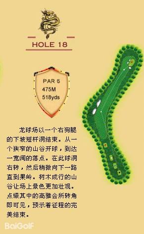 相比独角兽,龙之谷的地势落差没有那么大,但由于主要球道都建在山脊之上,与山谷平行,景致更佳,不少人觉得它是红旗谷必打的18洞。1号洞下坡击球,球道很宽,瞄准左侧沙坑方向便是,250码内绝对安全。只要不出现Slice,开局保平标准杆的可能性很大。6号洞虽是龙之谷最短的4杆洞,蓝Tee长度只有346码,但它绝不容易。发球下山坡,陡峭的山谷让人觉得下山坡更急。在落点前面的球道区域很宽阔,但是球道在右转越过转点区之后急剧下降直到果岭,1号木杆在此洞并非开球最佳选择,除非你喜欢第2杆时的下坡球位。攻果岭一杆仍是下坡,选杆至少要小一号。想要拿下标准杆,还得避开果岭前的小沙坑。