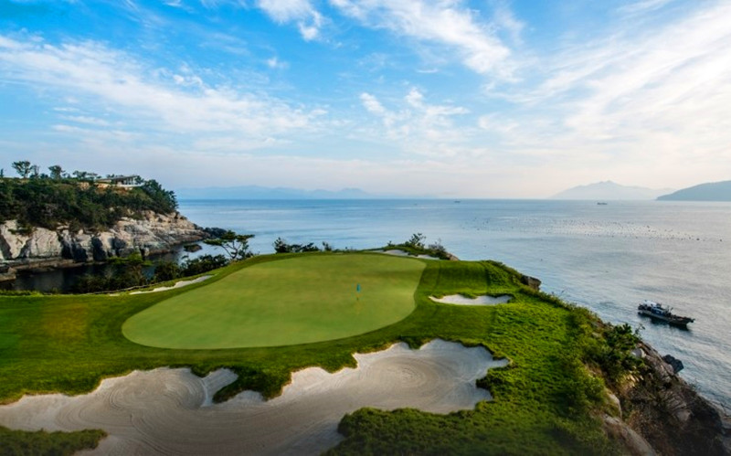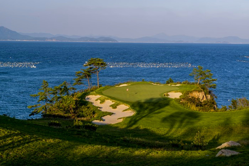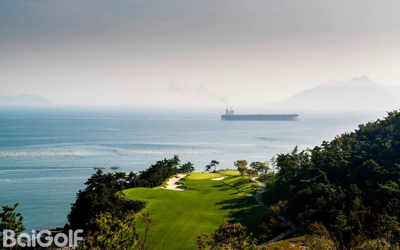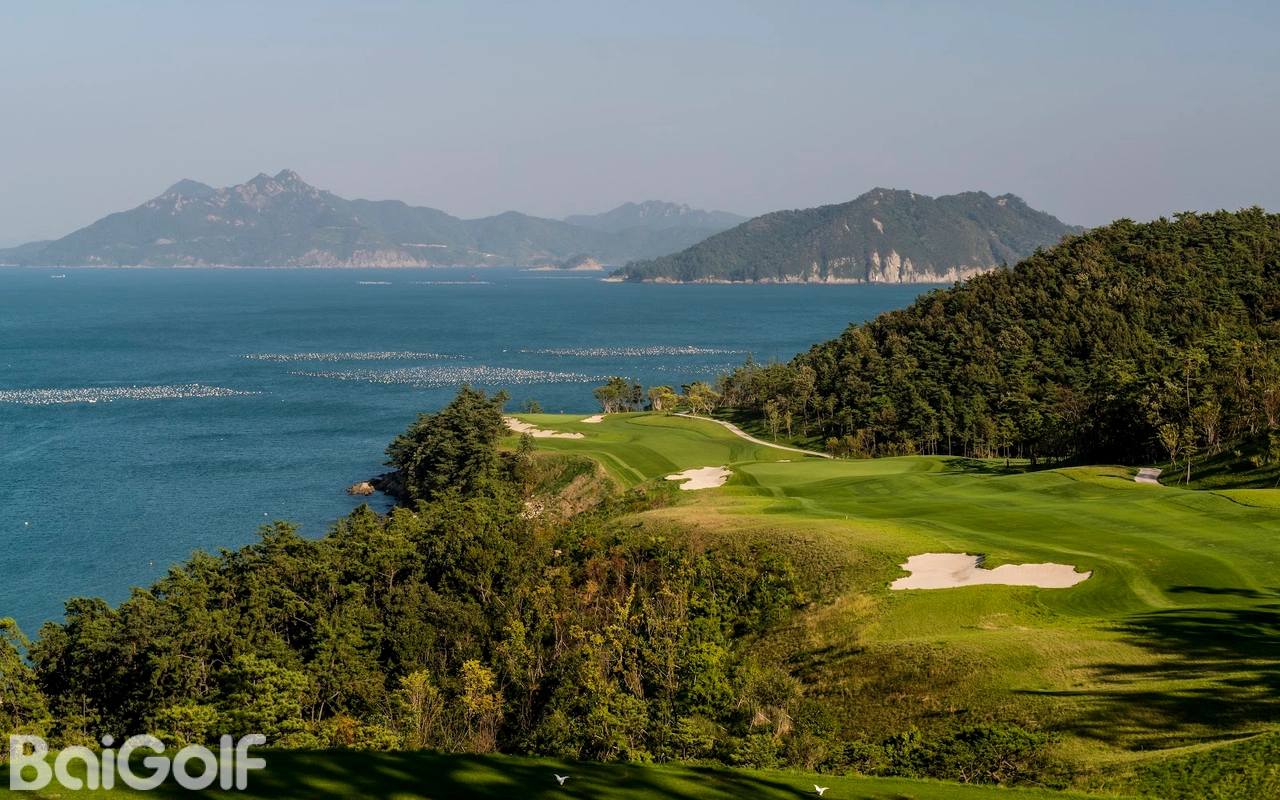 开球台和球道上都种上了蓝草。浅草区混合着优质的香茅草,果岭上铺着美国进口本特草。球道的两边粗黑的黄岗岩当作界标。11号5杆洞以下坡开球让人印象深刻。135米长14号3杆洞和204米长的16号洞,水池遍布,挑战连连,让人兴奋。