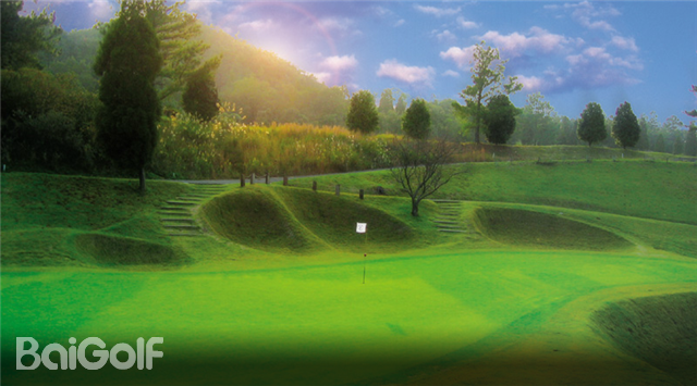 丘陵球场。东球场通过搬移沙土建造而成,各个球洞都配置有水池障碍,周边景观优美。中球场像是丘陵球场,富有变化,战略性丰富。根据球洞的不同,两层式果岭的形状各异。西球场始于平缓的斜坡,所有球洞都很平缓,同时也配置了障碍。果岭起伏较大,两层式极富特色。