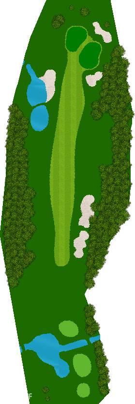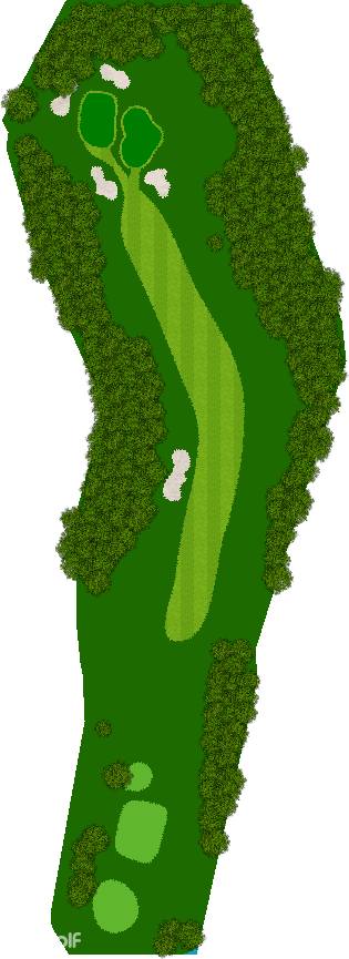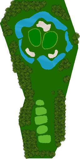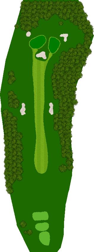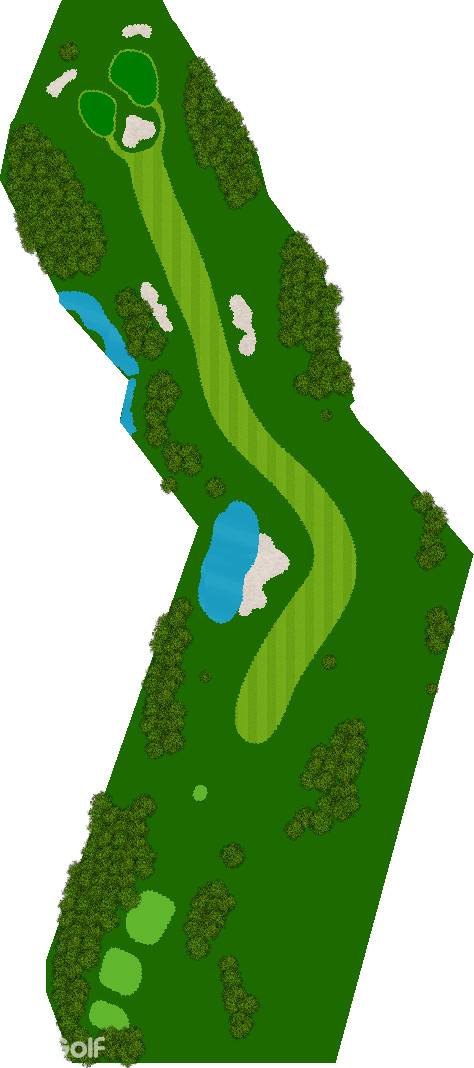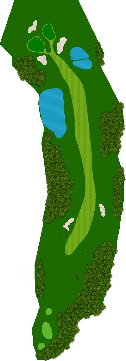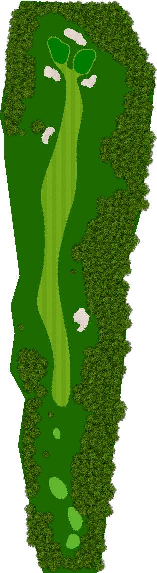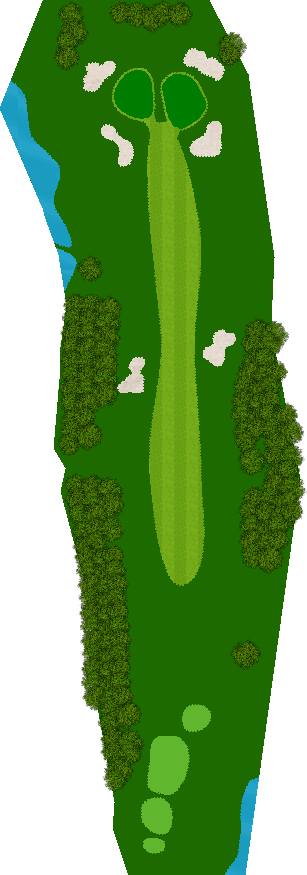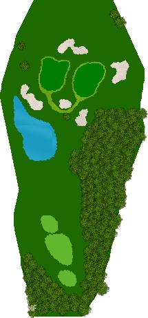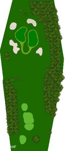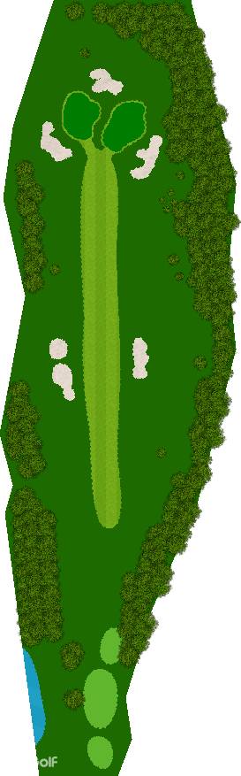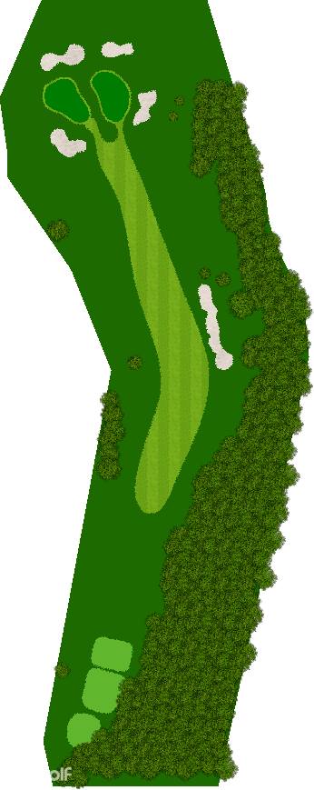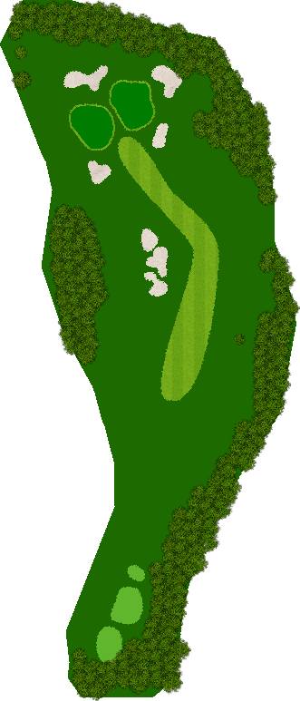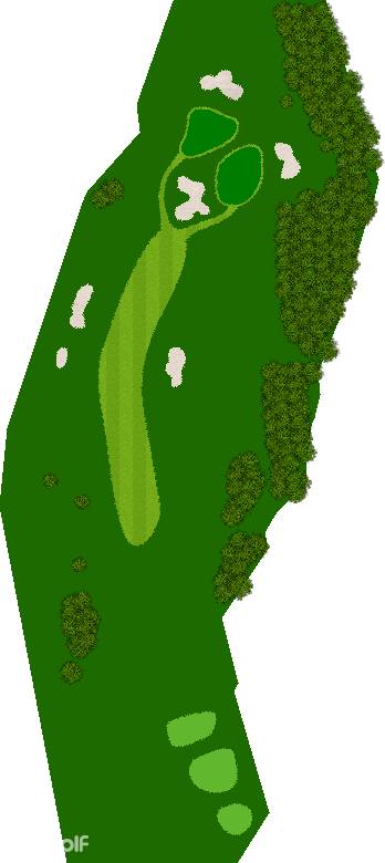 保留了自然平缓的倾斜地形的长距离丘陵球场。有的球洞下坡、有点球洞上坡,变化丰富。前半场的4号洞是左狗腿,距离短,是个简单球洞,但是左侧连绵的沙坑不得不防。9号洞是长距离球洞,果岭前水池横卧,把球击落在哪里是个关键问题。后半场13号洞是名洞,果岭被水池包围的短距离球洞,距离超过180码,一杆上果岭比较困难。