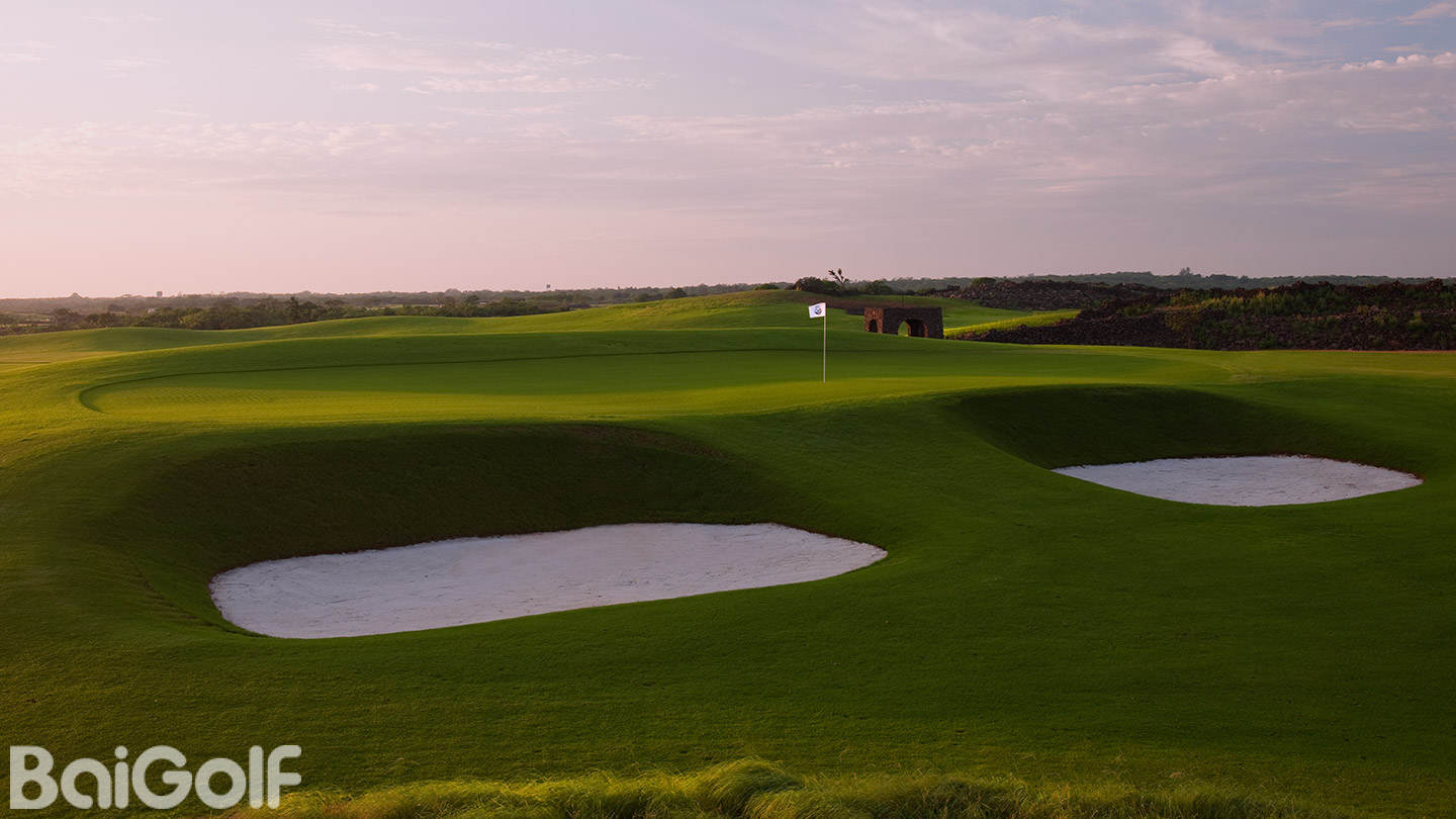 根据美国东部的美国公开赛使用球场的特征,将一些沙坑和球道的轮廓线都左侧几何形状,再加上“教堂椅”沙坑和草面沙坑,还有原生草的融入给人一种辽阔的草原感觉,再加上偶尔出现的树木。果岭面积都比较大,增加了推杆难度。
