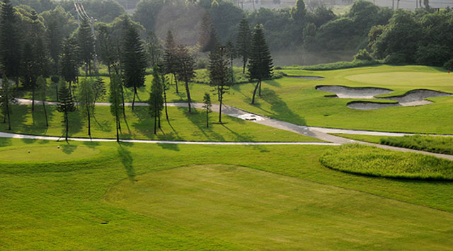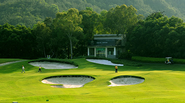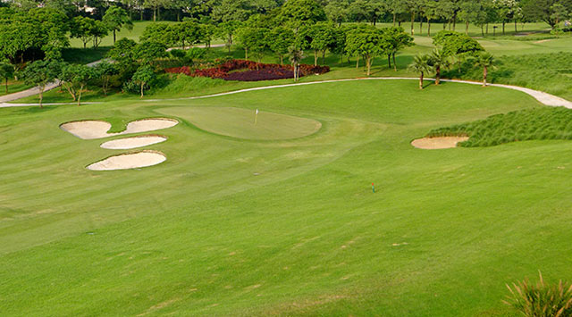 东侧球场(18洞)兴建于1991年,依山面海,最能体现大白鲨格雷格·诺曼的骁勇野性风格,挥杆其中,犹如一场心理与技巧的冒险旅程。球道根据美人山麓起伏而设置,体现了诺曼设计风格:自然大气、粗犷豪迈。球道运用画眉草及蜈蚣草,随四季变化而形成丰富的视觉景观变化,沙坑、水池、长草等各类障碍设置使高球趣味与竞技挑战兼顾:沙坑环布,如东侧3号洞(5杆洞)果岭前为高起的坡道,坡道前缘有两三个大沙坑,果岭前又有沙坑,一不小心就深陷其中;水障碍与长草区暗藏玄机,如东侧8号洞(3杆洞)的发球台和果岭均邻水而设,球道边长草迎风飘扬,虽是短洞,如不适应也会容易击球下水或入草。在后9洞灯光球场,夜色下灯光迷离与树影婆娑相辉映,球道折射出迷人的夜色之美,鸟叫虫鸣,微风习习,击球其中,则别有一番浪漫风景。