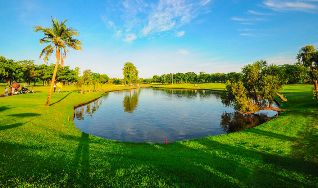 球场并不长,共有 5 组发球台,确保所有球手都能找到适合自己的打球方式。在曼谷高尔夫俱乐部,准确性比长度更重要,除了 3 个洞之外其他所有洞都有水,成熟的树木和 12 个大型湖泊是球场的主要景观。球场的特色之一是 3 杆洞,4 个 3 杆洞中有 3 个在水面上,其中以第 5 洞标志性的岛屿果岭最为突出,在该洞,任何错过果岭的球都会落到水里。该洞距离后发球台 150 码,不是一个长洞,但需要用铁杆精确地攻上位于一个大型人工湖中央的小果岭。第 11 洞也是一个岛式果岭,果岭稍长,果岭有一个边缘,因此不像第 5 洞那样令人生畏,但对所有水平的球员来说仍然是一个有趣的挑战。第 9 洞的双人形击球区五杆洞于1991年被高尔夫杂志评为世界最佳500洞之一。