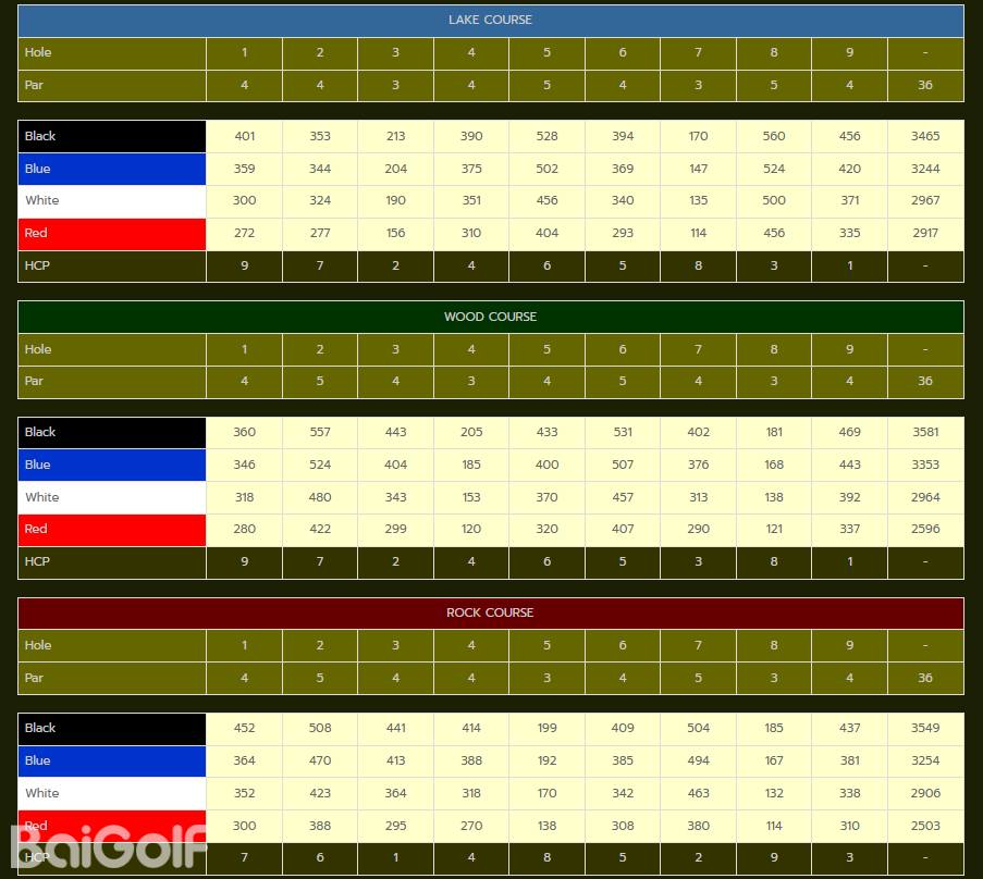 3개의 9홀 코스(레이크, 우즈, 록스)가 있으며, 모두 비슷한 스타일로 설계되어 약간의 도그레그와 약간 기복이 있는 그린, 워터 해저드가 있습니다. 이곳의 페어웨이는 넓고 버뮤다 잔디가 잘 관리되어 있습니다. 페어웨이는 배수가 잘 되지만 다소 축축하고 부드러워 라이가 좋지만 티에서 기복이 거의 또는 전혀 없기 때문에 코스의 길이가 설명된 야드보다 길게 느껴집니다. 그림처럼 아름답고 부러움을 자아내는 레이아웃과 국제 공항과의 근접성으로 인해 이 코스는 태국 골퍼, 외국인 및 태국 주재 외국인들이 즐겨 찾는 곳이 되었습니다!