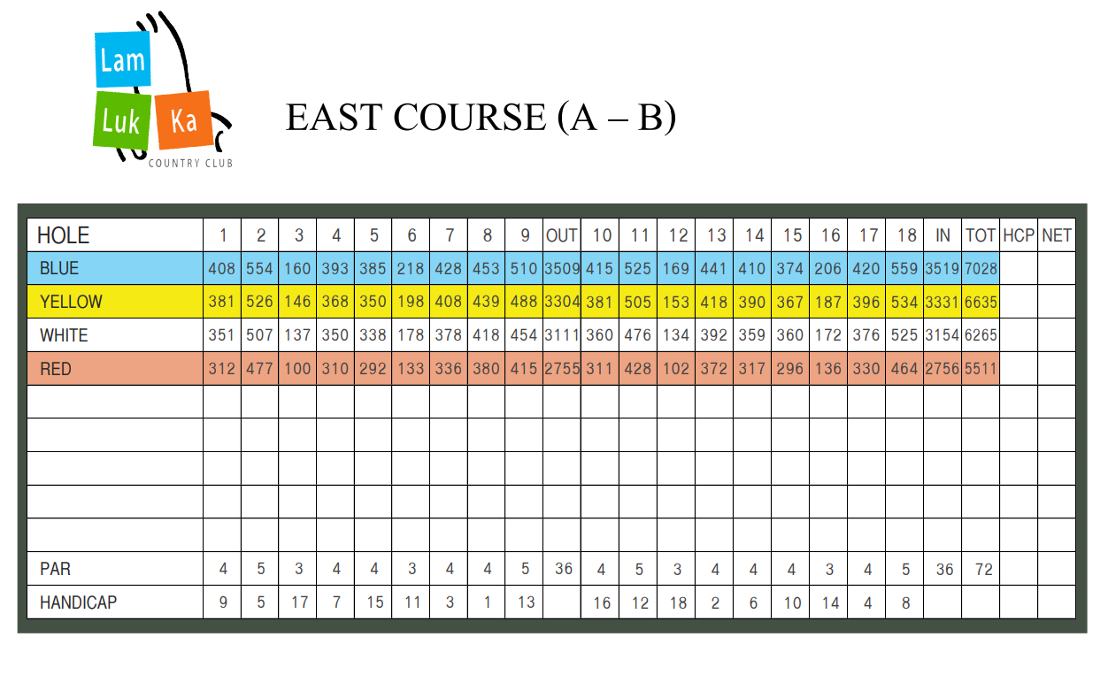 锦标赛东球场非常重视将球打得又长又直。作为 2002 年泰国 PGA 锦标赛的主办地,蓝卢卡东球场更适合各级水平的高尔夫球手,并能同时考验他们的球场把控技巧。后九洞被认为是泰国最好的球洞之一,以极具挑战性的的五杆洞结束。蓝卢卡锦标赛东球场仍然是泰国最具挑战性的球场之一。西球场相对较短,但 15 个洞中都有水,因此球场管理是得分的关键因素。每个洞都提供多种打法选择,让每个球手都体验到不同的乐趣。西球场是游客和休闲高尔夫球手的最爱,里面还有众多本土鸟类和野生动物出没。