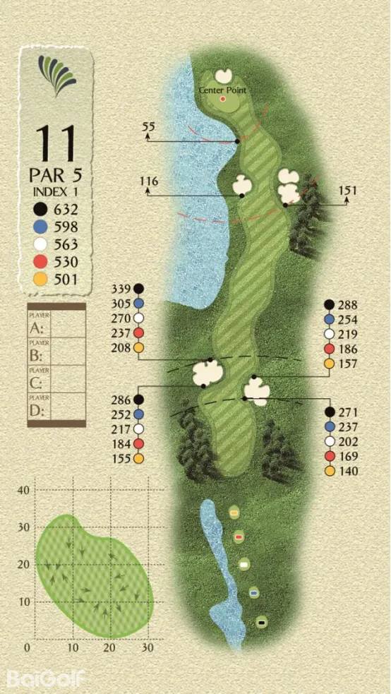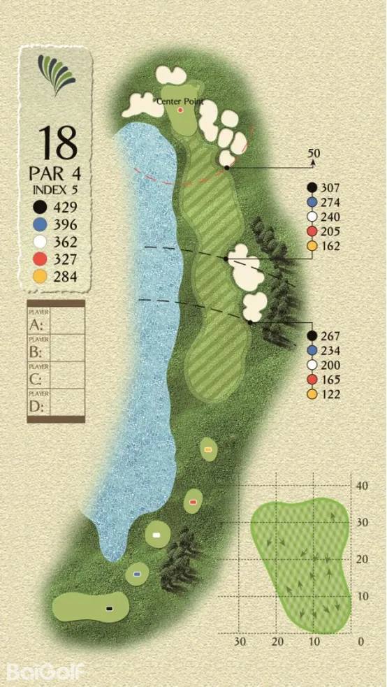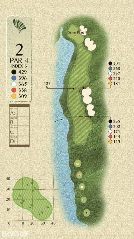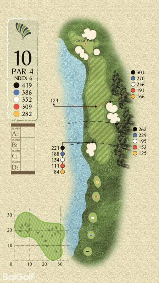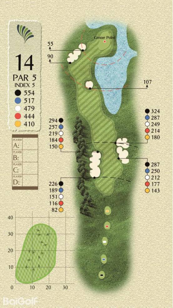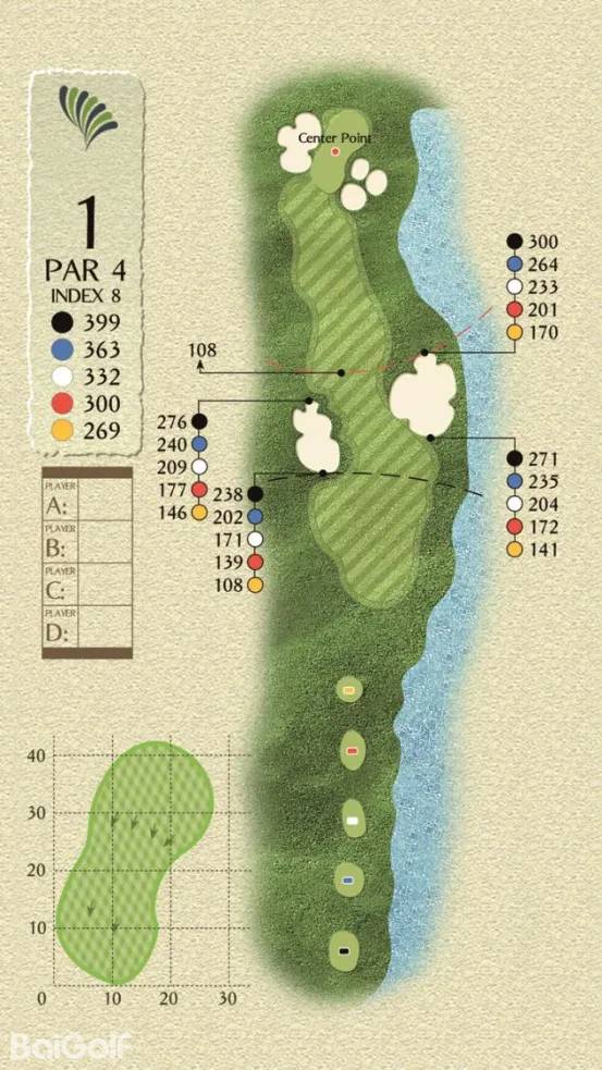 球场由科林.蒙哥马利设计,球场巧妙变化,贴近自然,球道周围水域环绕,青翠的球道与清澈透碧的湖水相辉映,令人赏心悦目。另外,造型独特的沙坑和变化多端的海风也时刻考验着球友的应变与智慧,充分显示传统苏格兰风格球场的迷人风采和国际赛场的独特魅力。