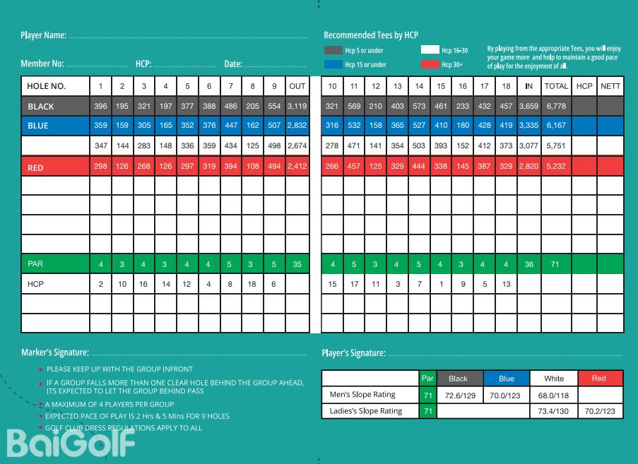 前九洞的许多球洞都以现有的自然景观和水体为背景,而后九洞则蜿蜒穿过成片的树木间。这里的沙坑并不常见,每一个沙坑的位置都经过精心设计,在必要的时候会显得非常突出。球场的战略布局要求击球时需要精准和策略,同时为各个级别的高尔夫球手带来有趣的挑战。挥杆时可以尽情享受安达曼海优美湛蓝的美丽景致,与青山层峦环绕下的清新宜人。