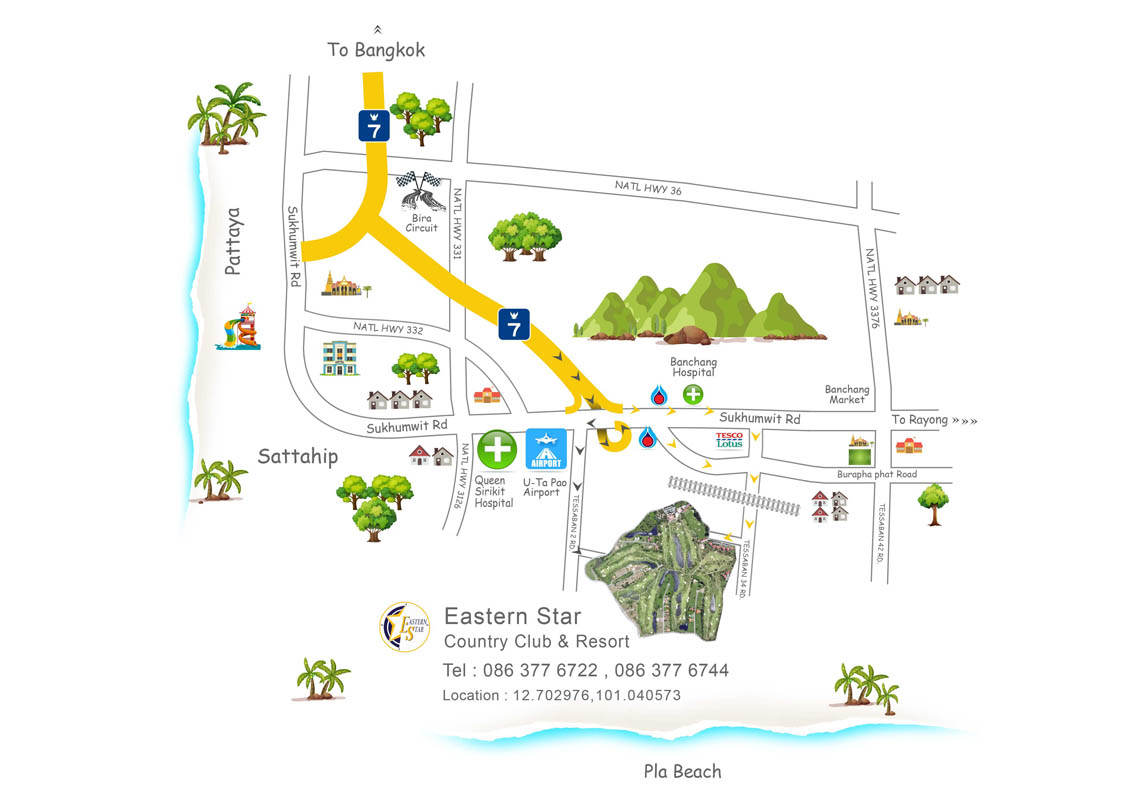 距离芭堤雅海滩(Pattaya Beach)50分钟车程(50公里)。距离芭提雅巴士站(North Pattaya Road)51分钟车程(51公里),芭提雅火车站(Pattaya Railway station)52分钟车程(55公里),芭提雅乌塔堡国际机场14分钟车程(14公里)。距离曼谷市区2 小时 40分钟车程(171公里),素万普那机场(BKK)2 小时 8分钟车程(150公里),廊曼机场(DMK)2 小时 52分钟车程(206公里)。