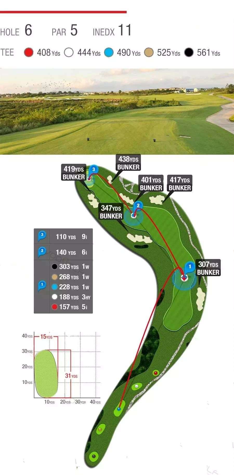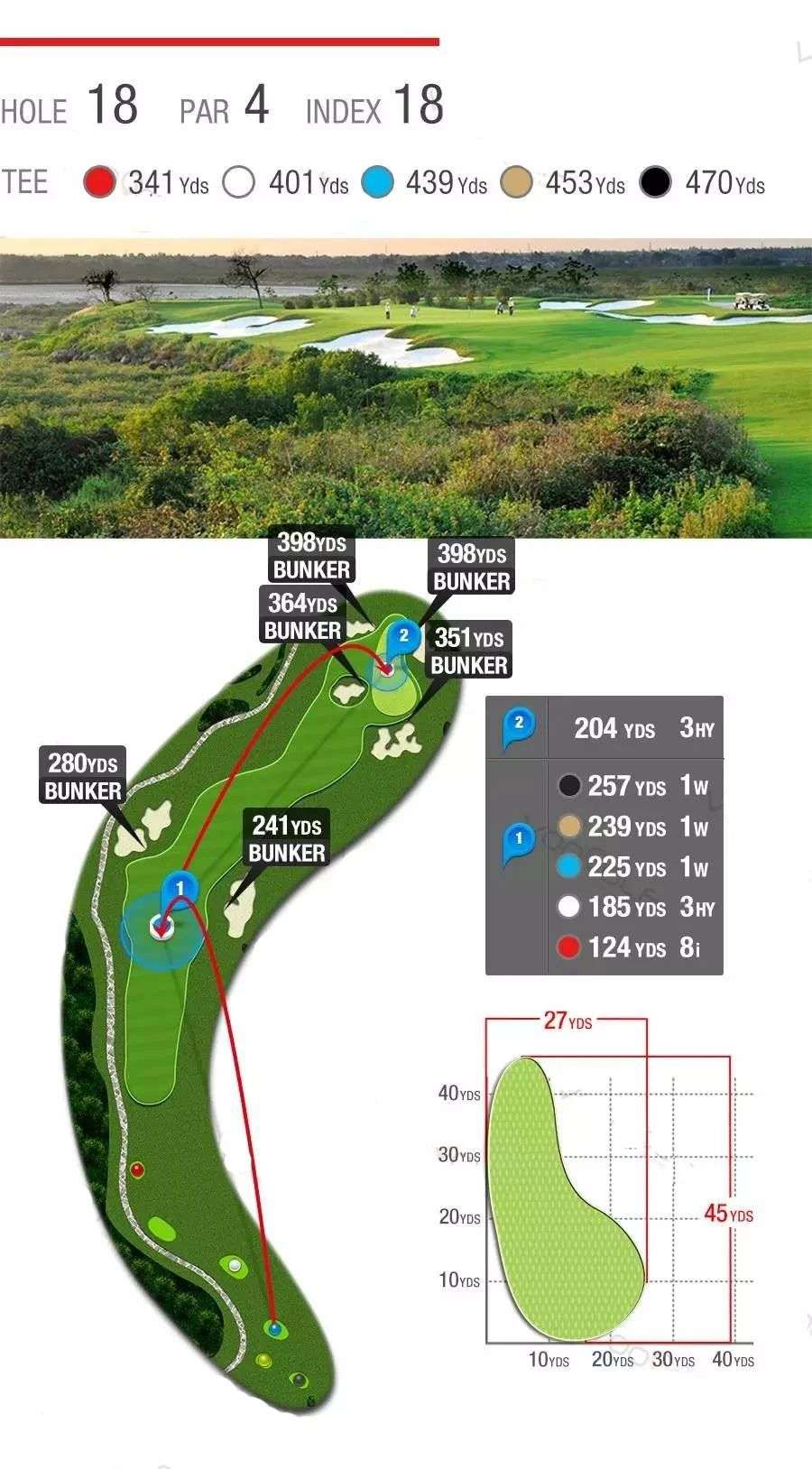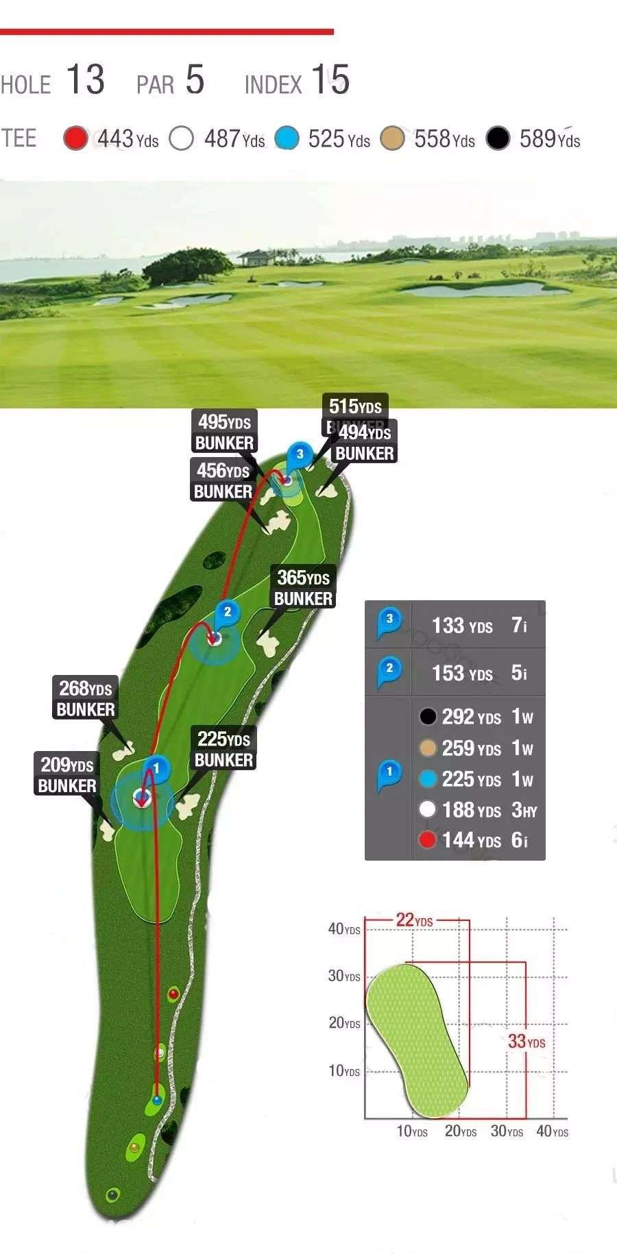柔软而惊险的沙坑、湛蓝而恼人的池塘,茂密而整齐的长草,9条球道环海,7572码全程海风吹拂,属于典型的滨海高尔夫球场,具有浓厚的欧美Links球场韵味。球道设计精湛、造型细腻,球道看似平坦,却暗藏玄机,兼具挑战性和娱乐性,能满足不同水平球手的需要,是兼具观赏性与挑战性的国际顶级海景球场。