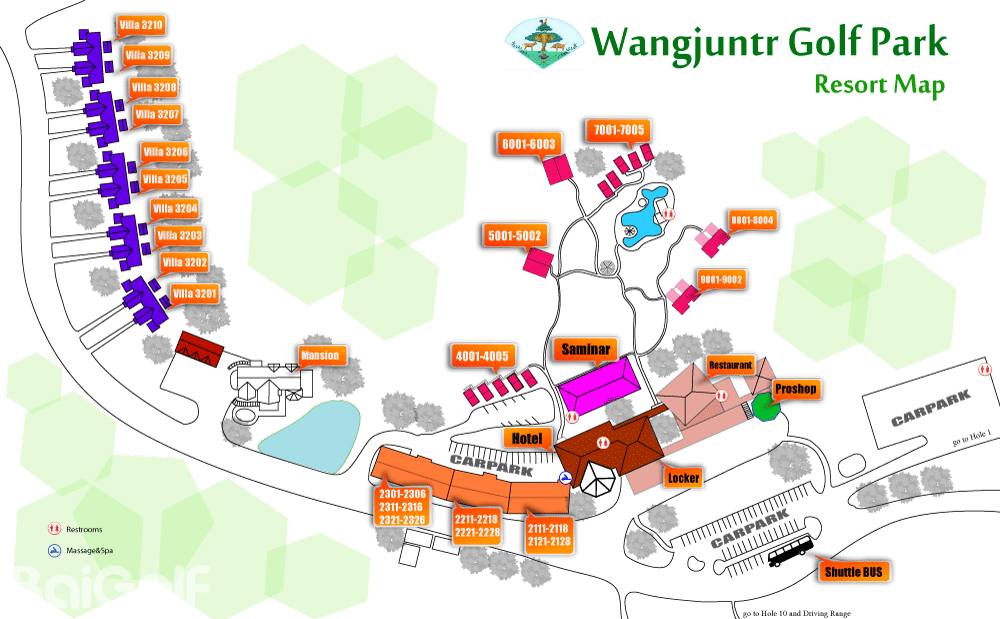 王君特高尔夫俱乐部有两个“孪生高尔夫球场”布局,每个都是18洞36果岭,和曼谷的玫瑰园俱乐部一样的布局。王君特的独特性不仅仅体现在双球场的设计,还体现在留在球场的原始地形。这两个泰国球场体现了锦标赛球场和自然野趣的和谐。