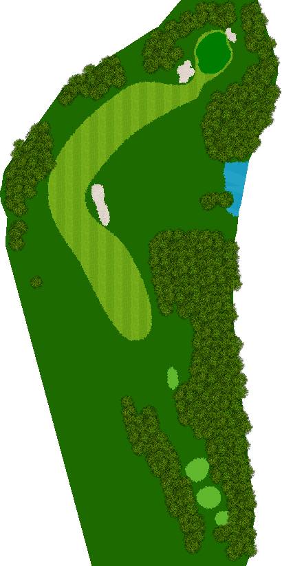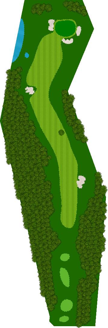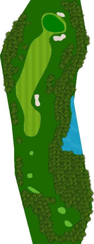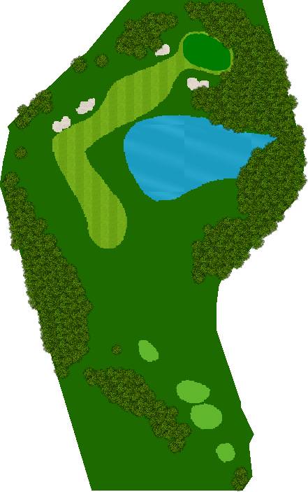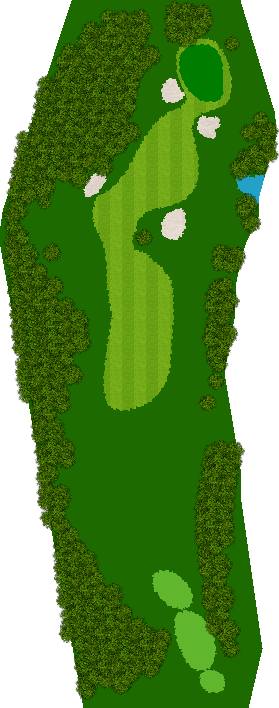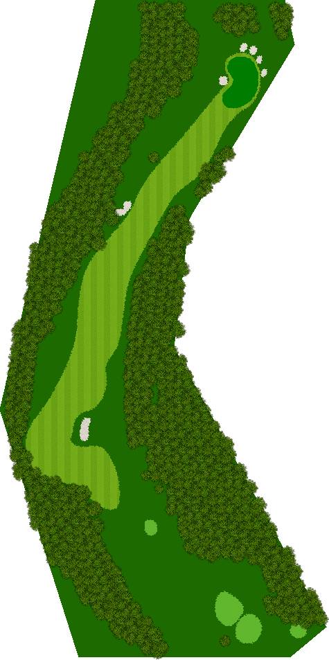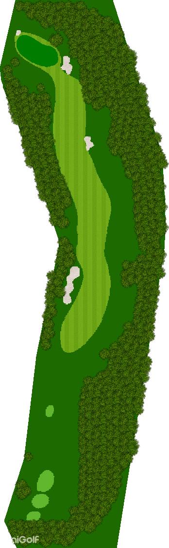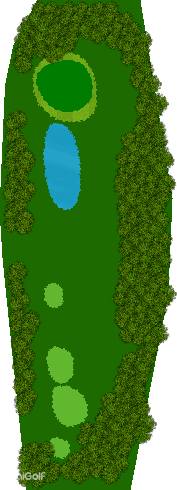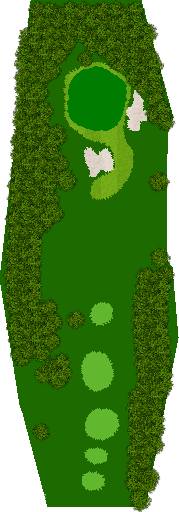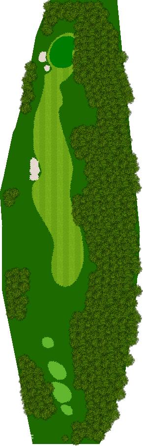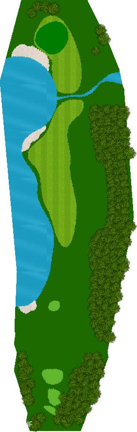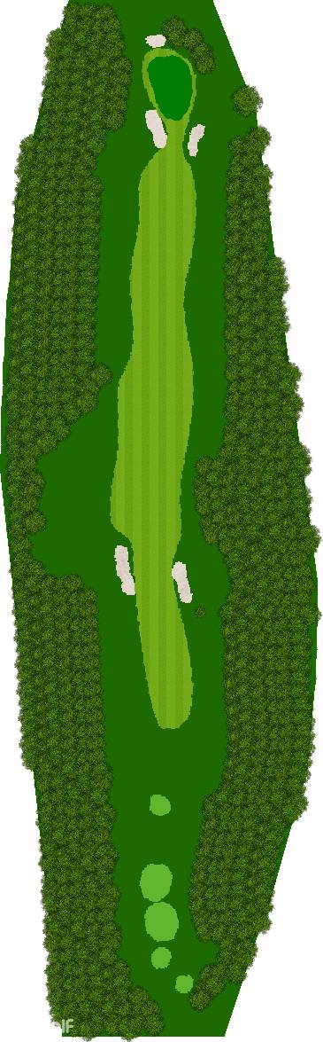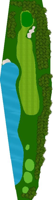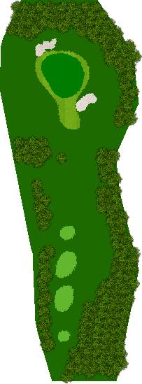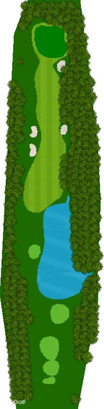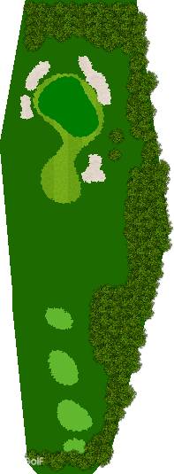 丘陵球场。第 1 洞是距离较短、地势平缓的上坡中距离球洞。虽然距离不长,但关键在于第一杆要越过发球台前方宽阔的大池塘。第 7 洞是一个右狗腿型的下坡中距离球洞,有可能一杆上果岭。如果对自己的击球距离有信心,尝试挑战一杆上果岭也是一件乐事。第 9 洞是呈 S 形的长距离球洞。由于很难找准击球目标,所以需要连续打出精准的击球。第 10 洞的难点在于球道中央有一棵弯曲的树。第 17 洞和第 18 洞相邻,中间隔着一个很大的池塘。因为池塘在左侧,所以绝对不能打出左曲球。