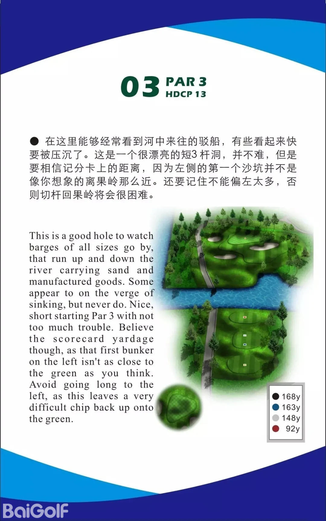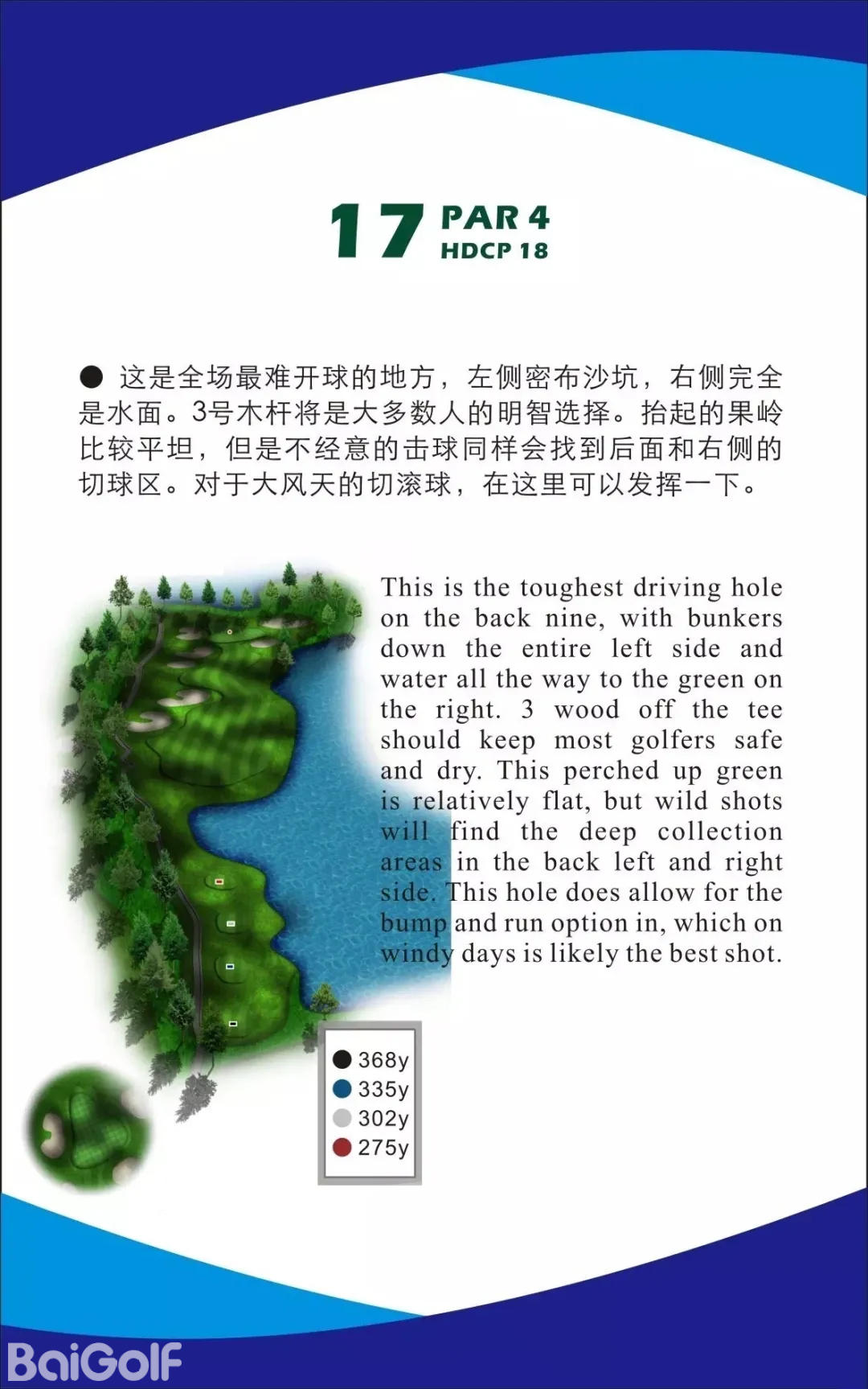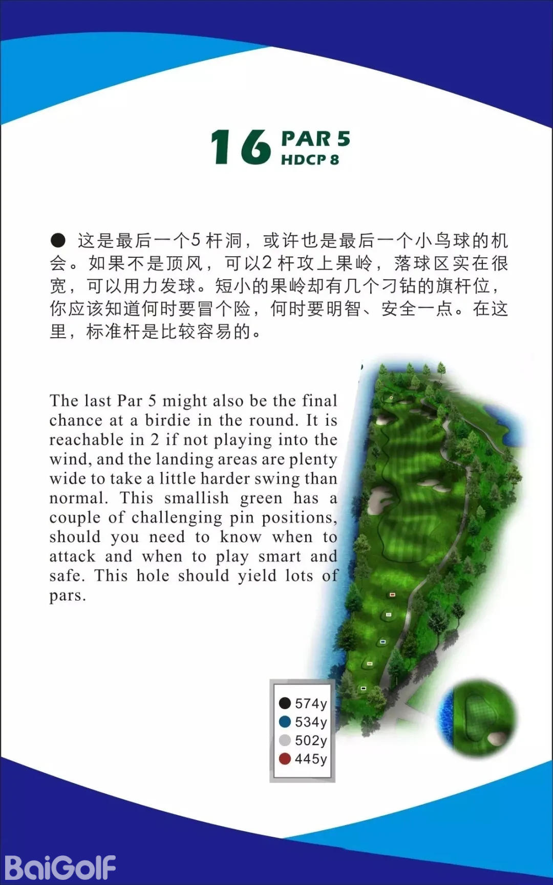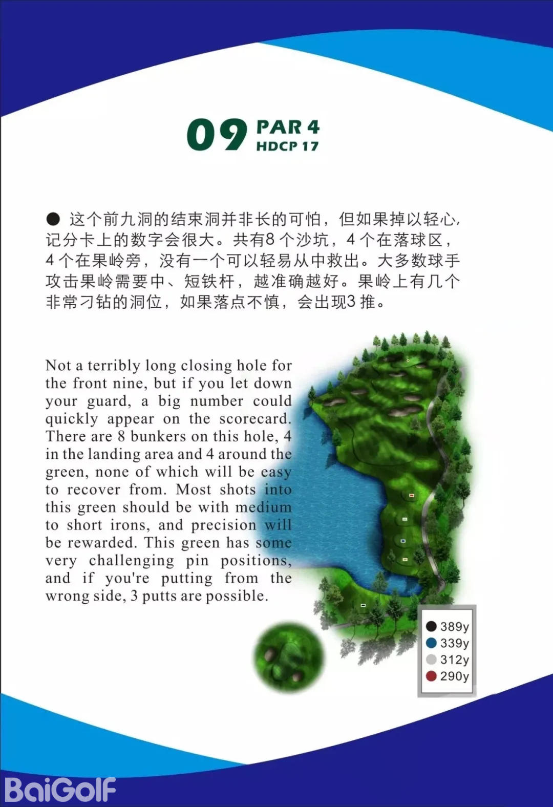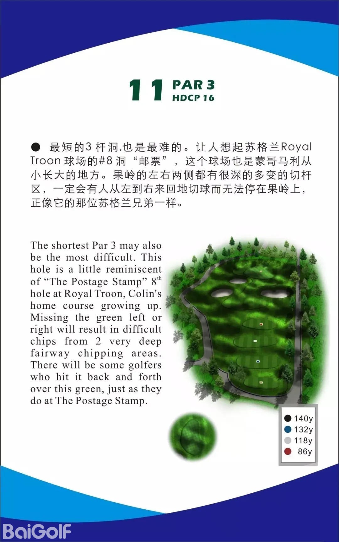 基于“最小破坏”的设计理念,球场拥有经典的蒙氏风格,面积狭小的果岭,加之此起彼伏的沙坑、巨大的水泊,处处暗藏杀机。18个各具特色的球洞在提供绝佳击球环境的同时,也挑战着球手的智慧与勇气。(如11号洞,就像科林故乡皇家托恩球场著名8号球洞“邮票”。)