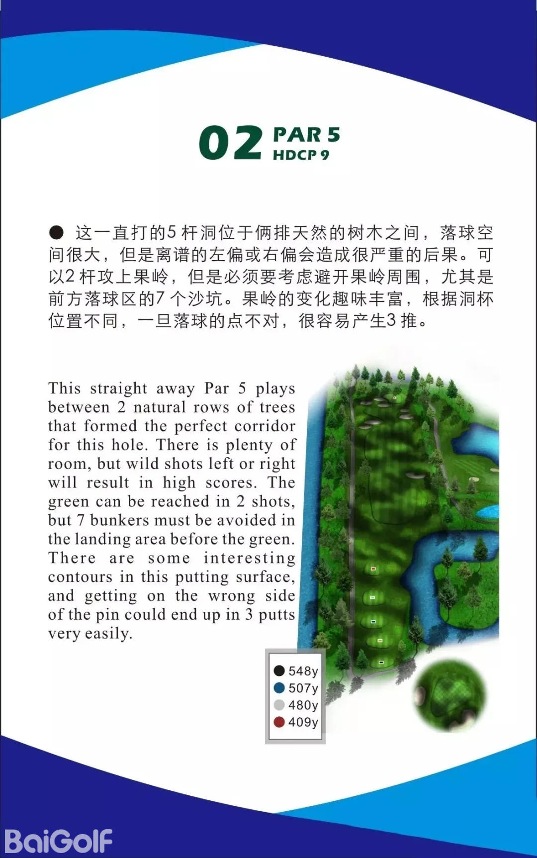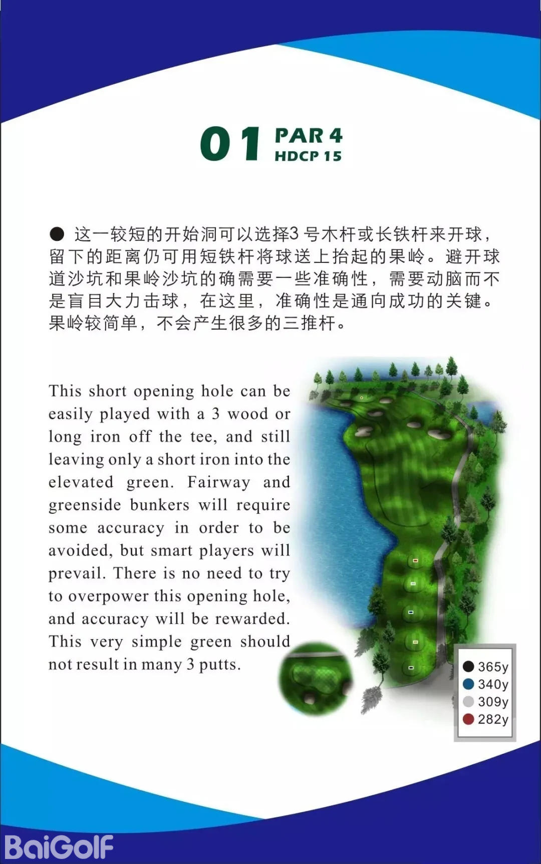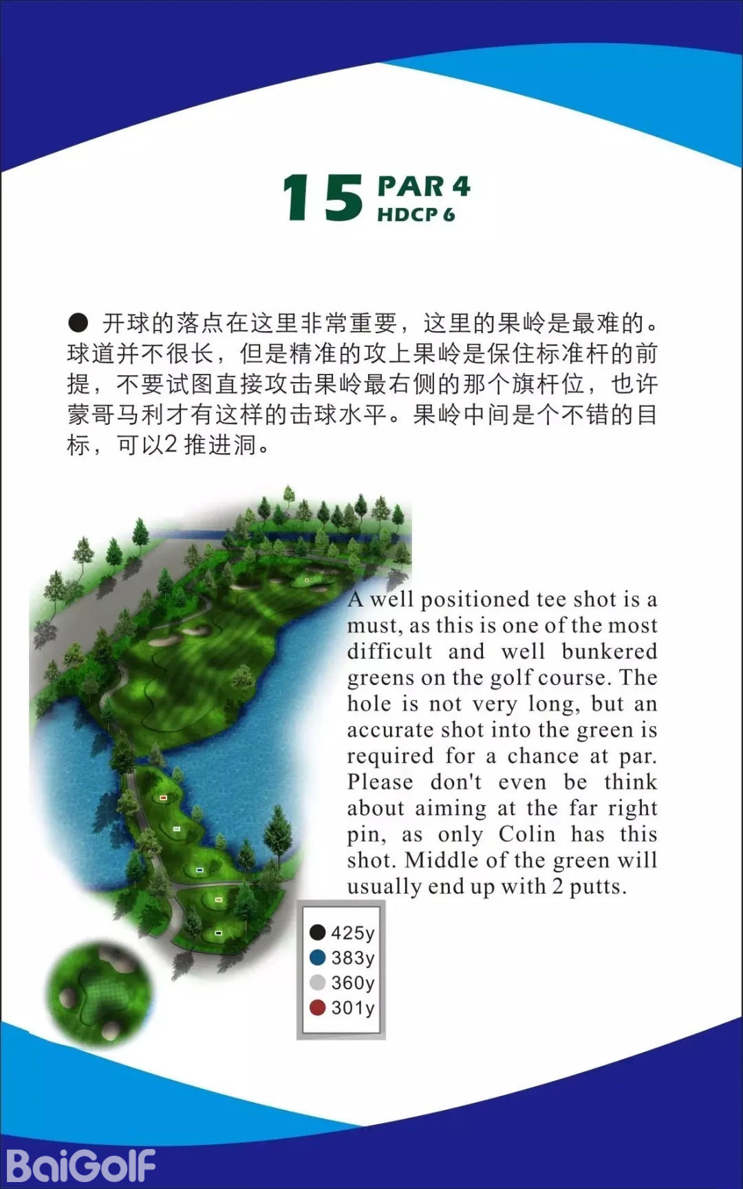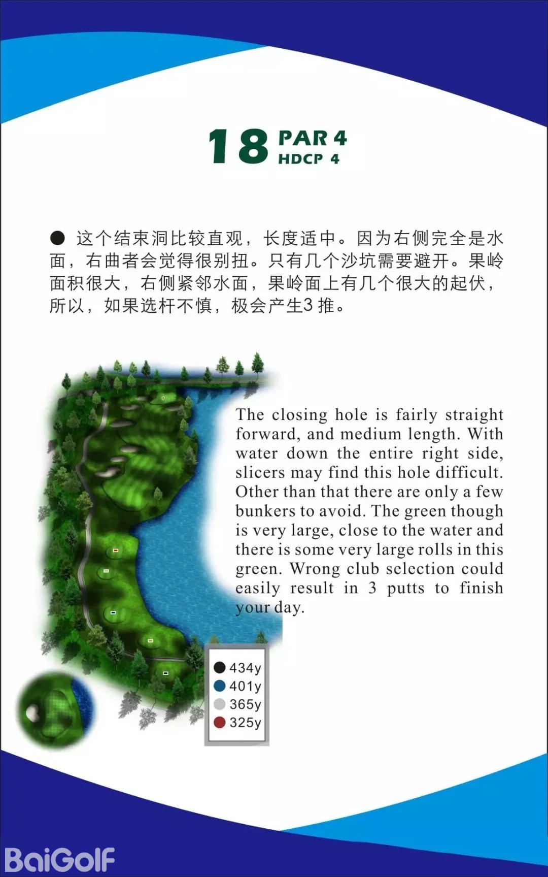 基于“最小破坏”的设计理念,球场拥有经典的蒙氏风格,面积狭小的果岭,加之此起彼伏的沙坑、巨大的水泊,处处暗藏杀机。18个各具特色的球洞在提供绝佳击球环境的同时,也挑战着球手的智慧与勇气。(如11号洞,就像科林故乡皇家托恩球场著名8号球洞“邮票”。)