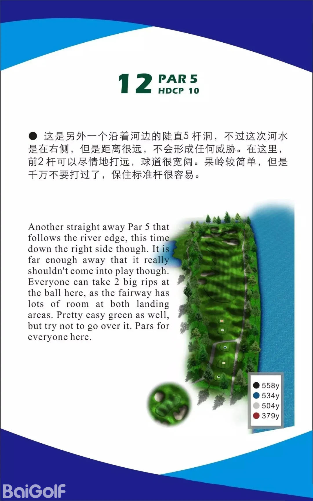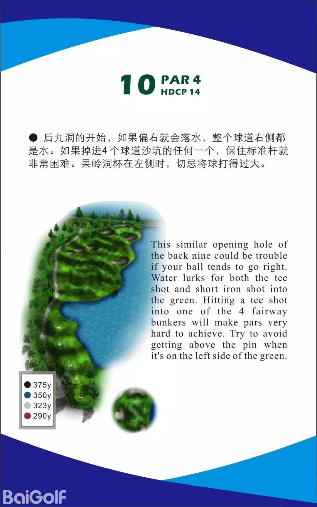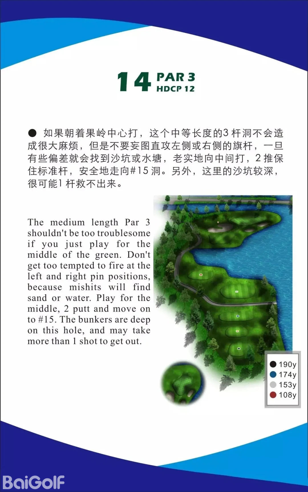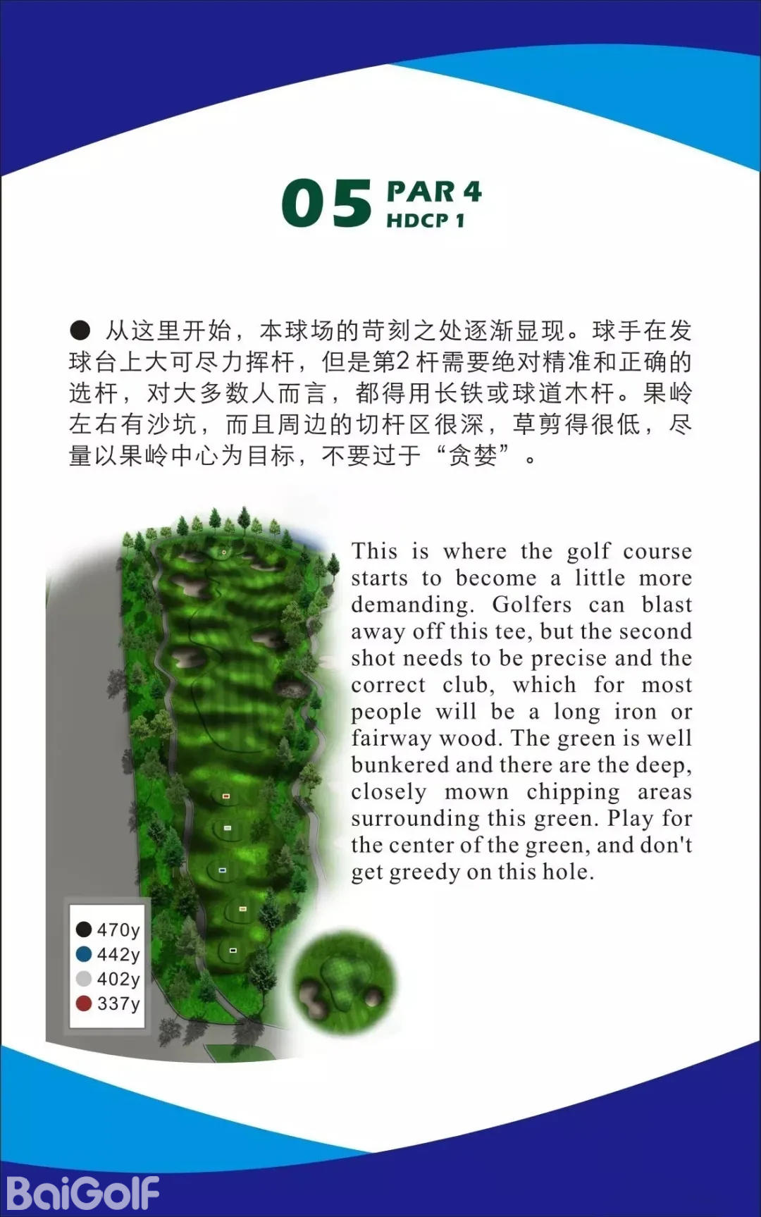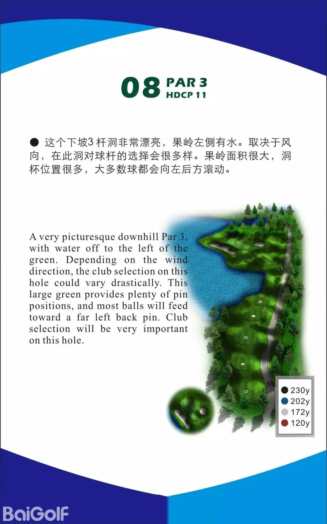 基于“最小破坏”的设计理念,球场拥有经典的蒙氏风格,面积狭小的果岭,加之此起彼伏的沙坑、巨大的水泊,处处暗藏杀机。18个各具特色的球洞在提供绝佳击球环境的同时,也挑战着球手的智慧与勇气。(如11号洞,就像科林故乡皇家托恩球场著名8号球洞“邮票”。)