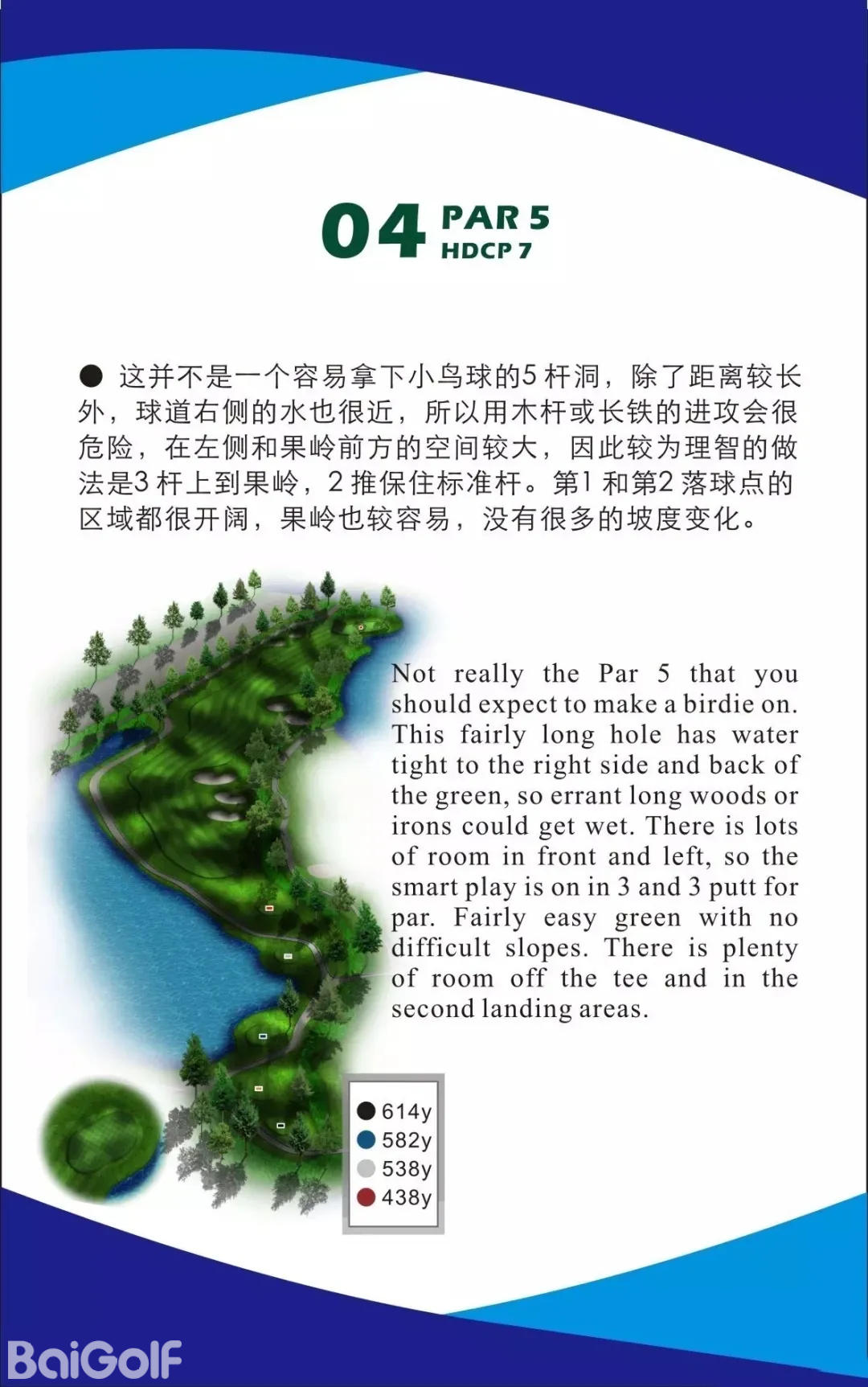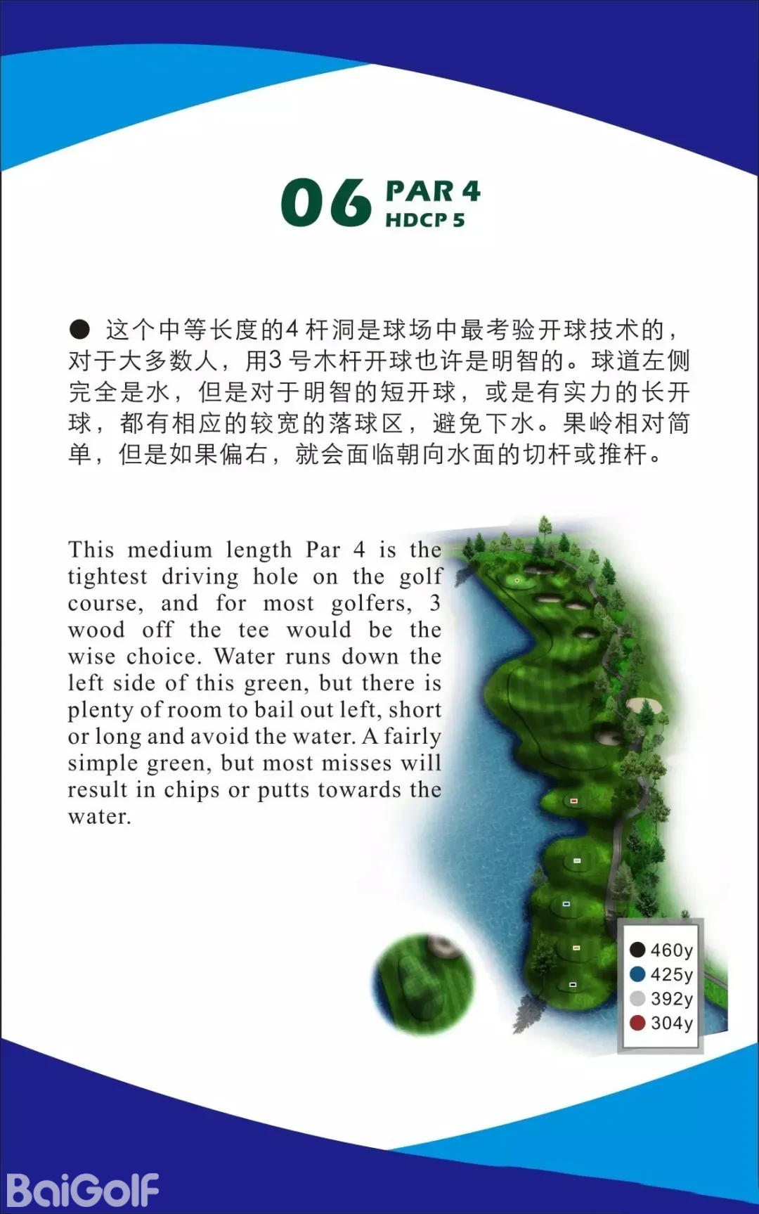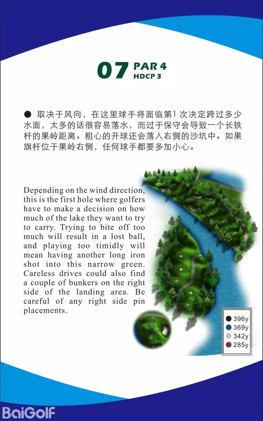 球场果岭面积狭小,沙坑密布、水障碍众多,可谓处处暗藏杀机。在这个标准杆72杆、18洞的球场,是挑战球手智慧与勇气的战场。会所,酒店,别墅均依球场而建,球场则成其天然背景。窗外新旧浏河相连,湖水贯通循环,辅之风格迥异的小桥,构筑绝美景观。