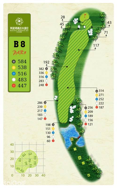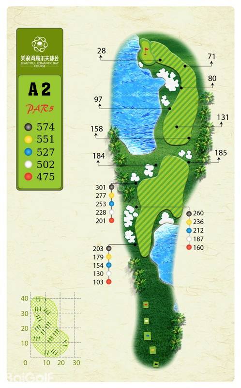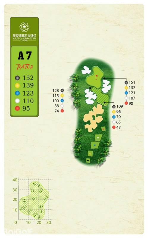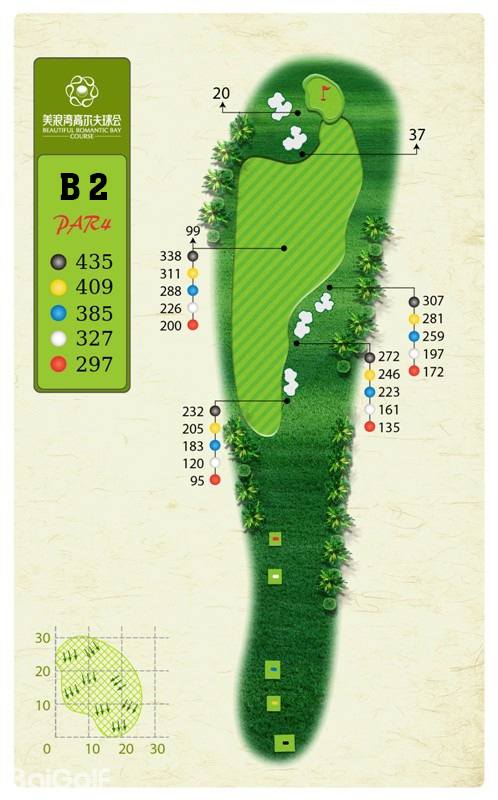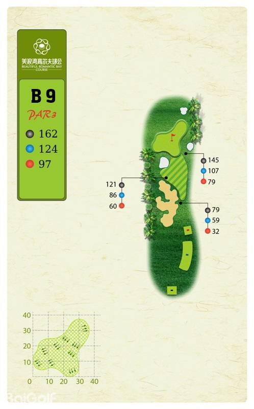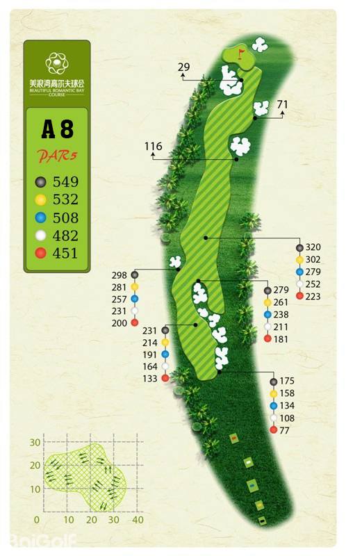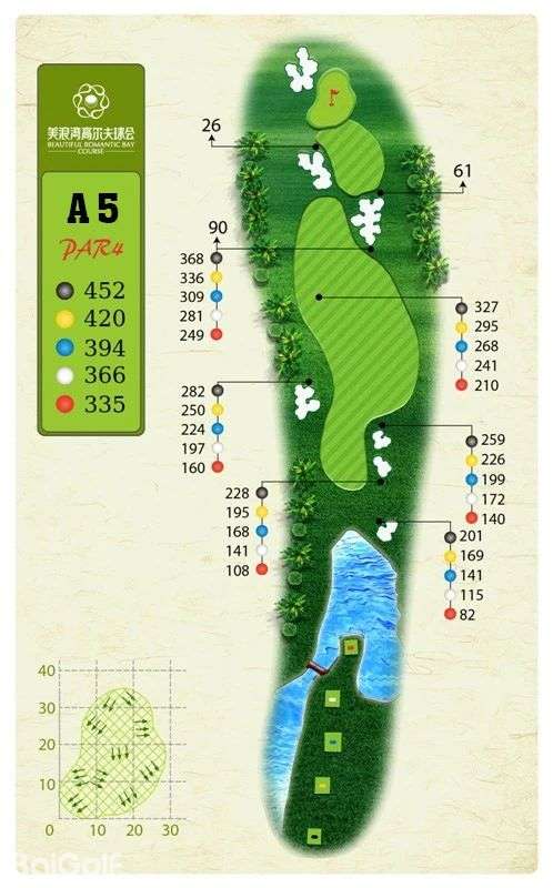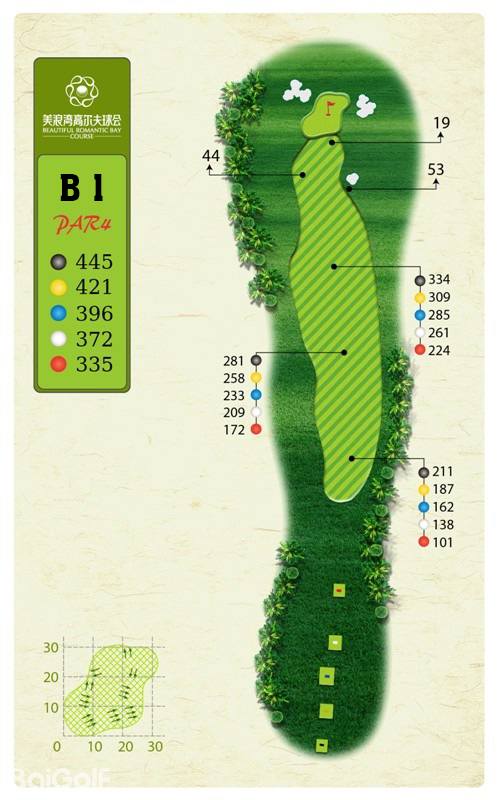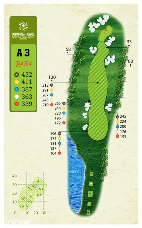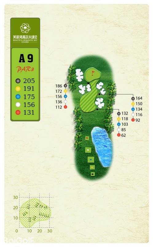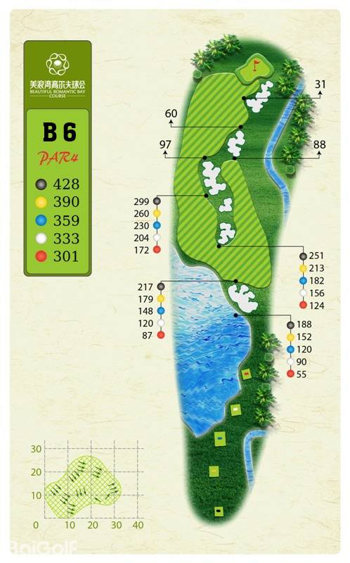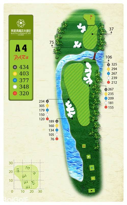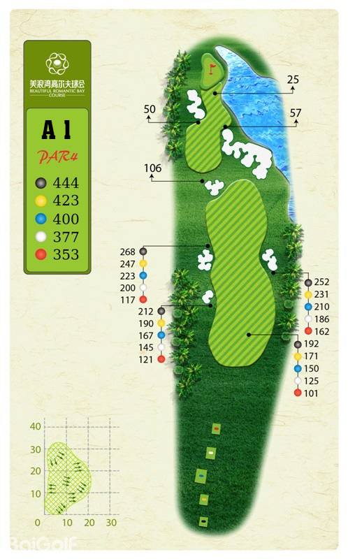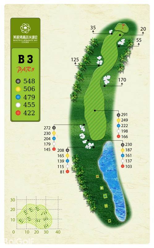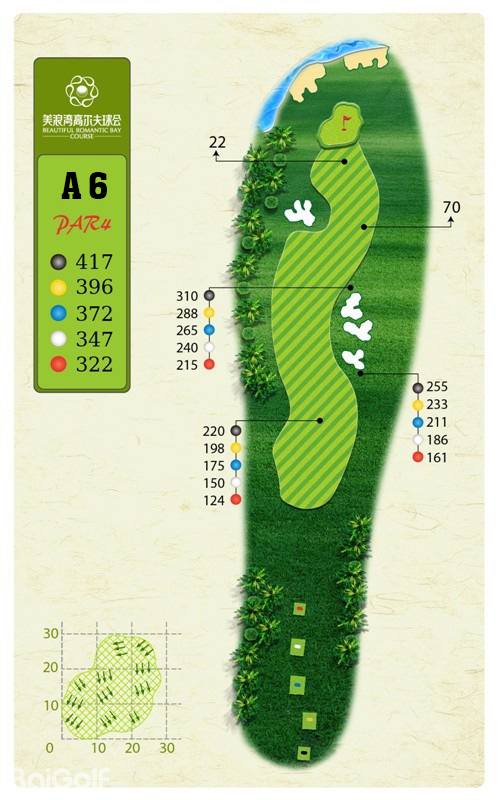球场由马来西亚著名设计师CJ TAN担纲设计。球场造型丰富独特,气势磅礴。球场富有山地特色,球道围绕会所呈辐射状布置,使得打球线路清晰流畅。球道全长7,250码,布局合理,并巧妙的结合河流、湖泊、沙坑等障碍物使之更富有挑战性及趣味性。球道及果岭统一采用了美国认证的白金TE母本草,不仅能提高果岭的速度和难度,还能确保球道四季常绿。球场庞大的地下排水管网系统解决了海南岛目前大多球场排水难的困扰,让球手们可以全情投入到美妙的挥杆之中。