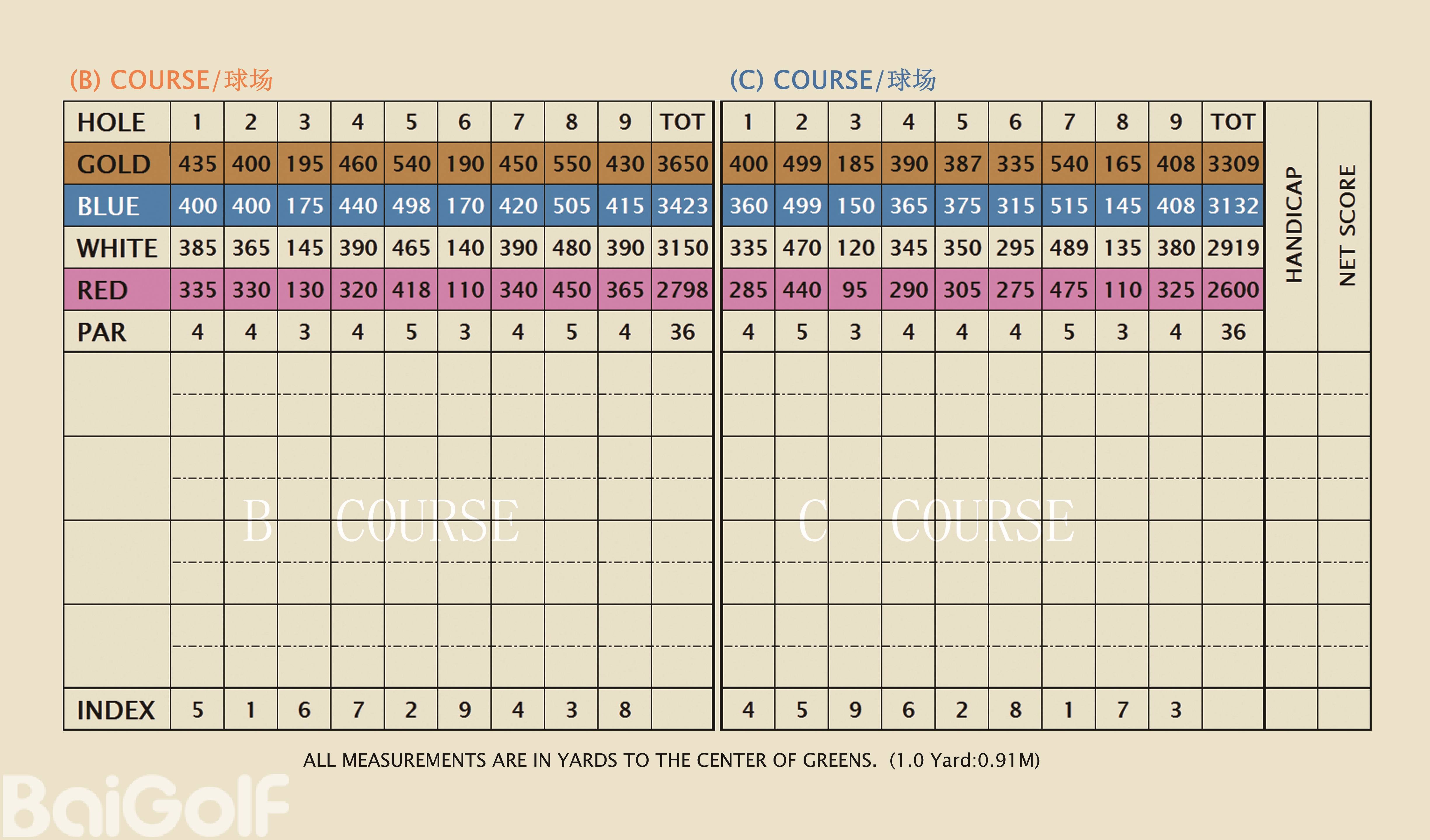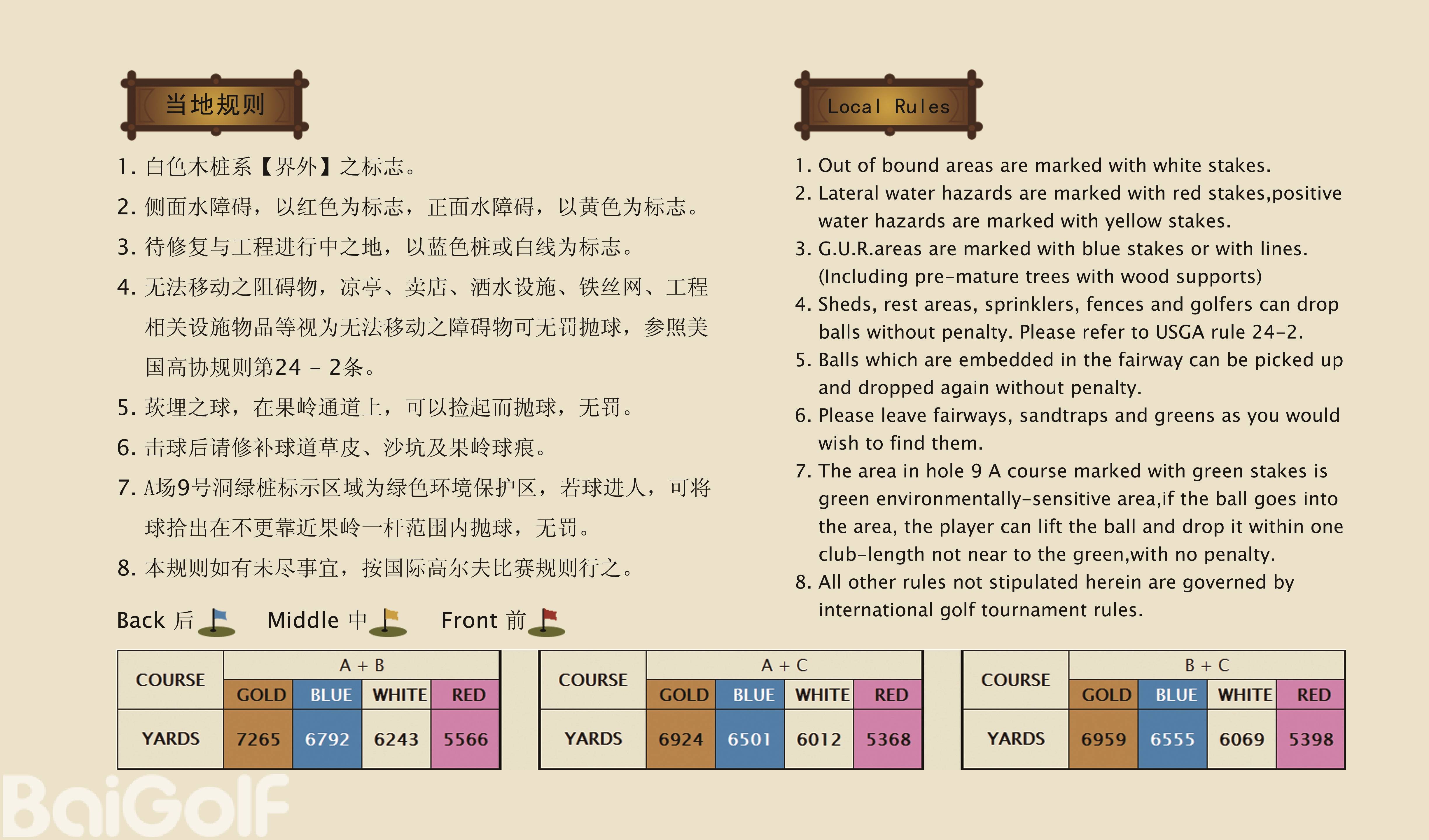 高尔夫会所占地约15,000平方米,外围运动休闲相关设施近6,500平方米,园区内绿化率超过70%,整体景色优美怡人。球道设计由国际知名设计公司Nelson&Haworth担纲,共27洞,分为A、B、C三个场区,球道动线起伏有致,落差最大达18米,全面符合USGA标准。