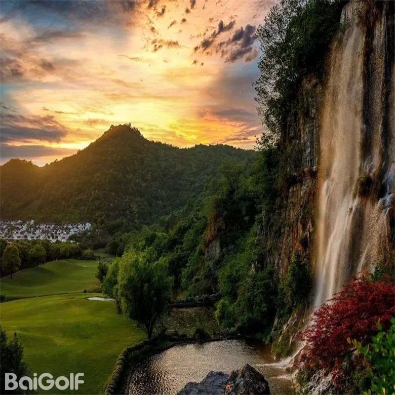 莫干山麓球场依山傍水,抬眼即见莫干山一线旖旎风貌,侧耳即闻花草清香,感悟山岭清润情怀。18洞的山崖瀑布,落差达40米,是国内唯一的高尔夫景观瀑布。