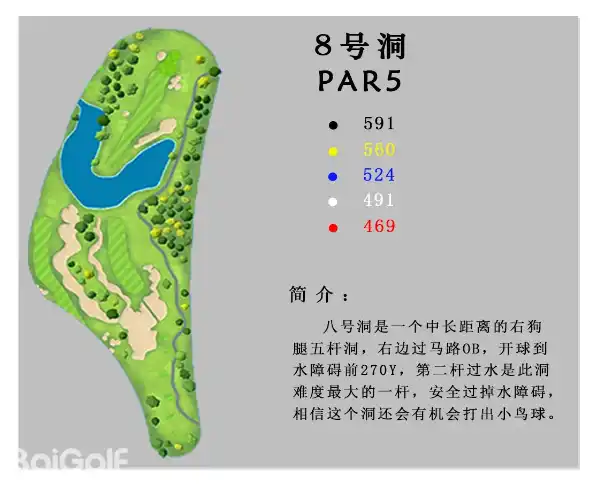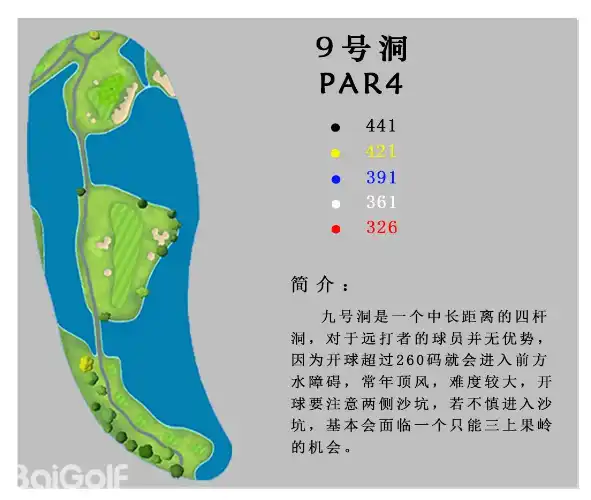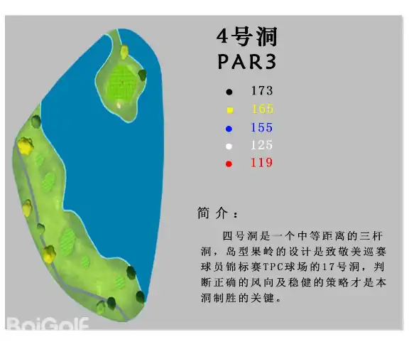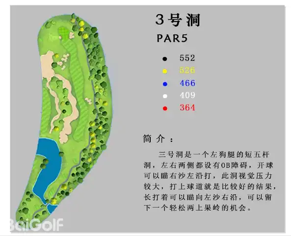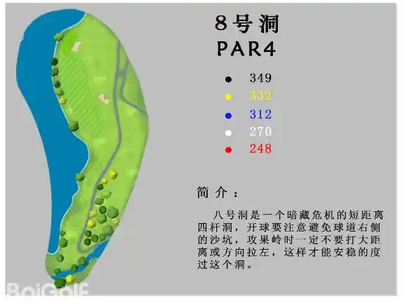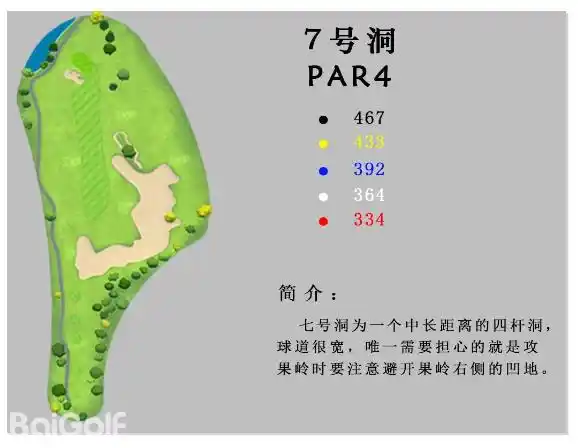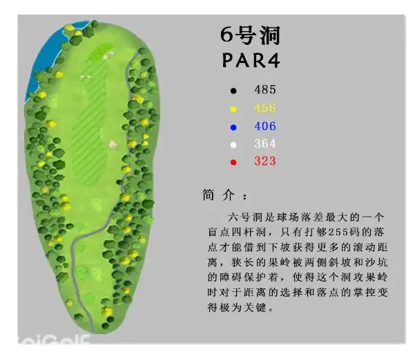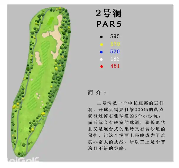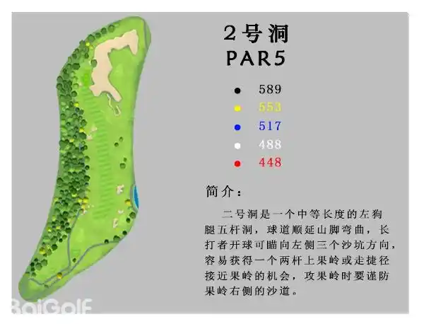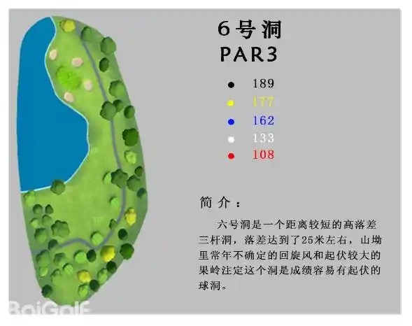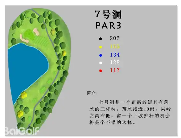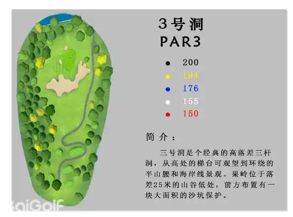 由美国排名前三位的著名高尔夫设计师RONGARL 亲自设计。球场优势:6座山镶嵌,峡谷造就落差30米、海拔150米高难度、大景观球道。3A发球台建立在山顶之上,临峰望海,风景极佳。7C果岭起伏比较大,前后较低,中间较高,落差有十几米,是整个球道中地理位置最好的球道。5C球道的尽头就是个天然的采石坑,气势宏伟,且果岭后的10码处是水障碍,要小心应对,防止球面临着下水的危险。