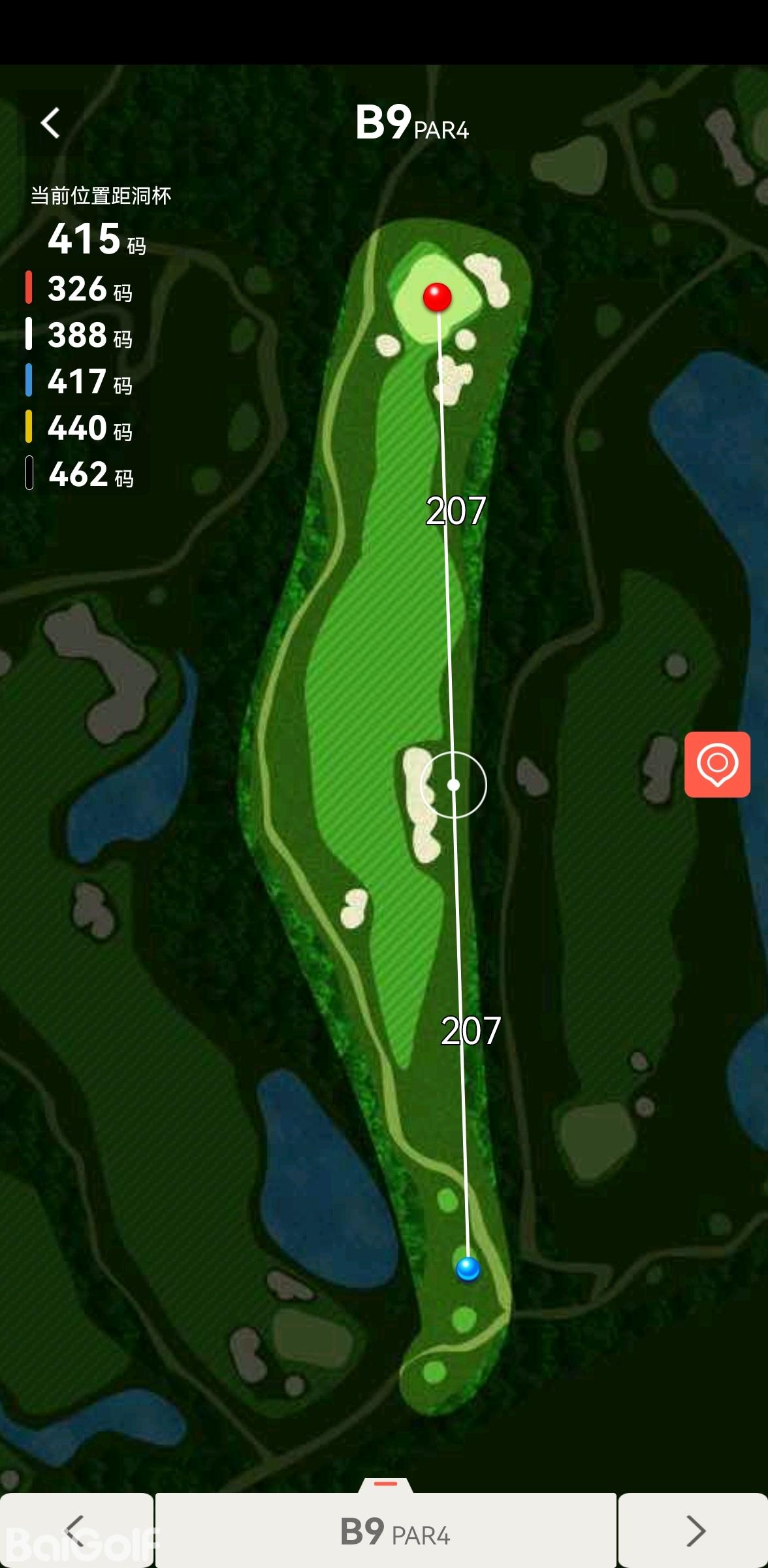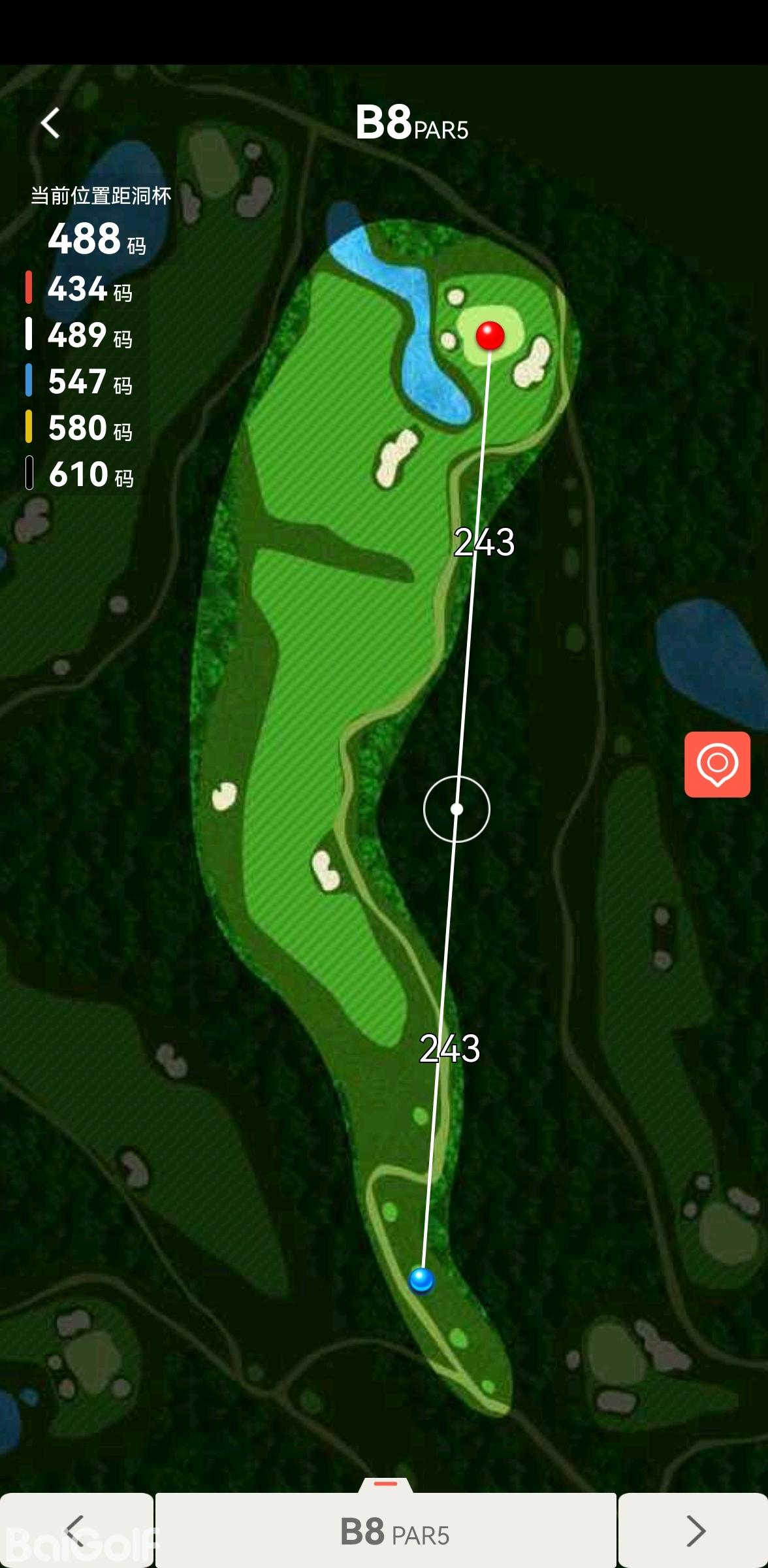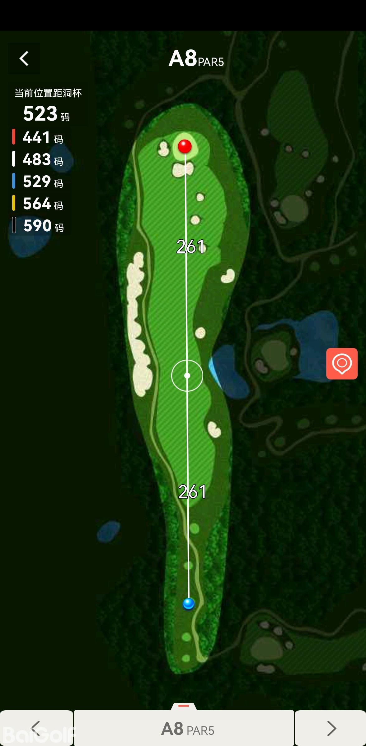 17号球道,PAR5,蓝TEE 547码,高落差,是典型的右狗腿洞。球道虽宽,但落球区域很小,整体呈现斜下坡状态,而且果岭前方有50码左右的湖面,左右各一沙坑,极具挑战。球道的落差、山崖的阻隔、倾斜的球道,都为挥杆者设置了重重障碍,当然,如果您的短杆落点准确,在此收获一个小鸟也是极有可能的。