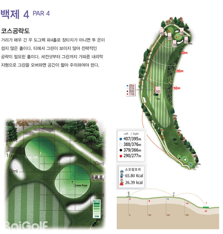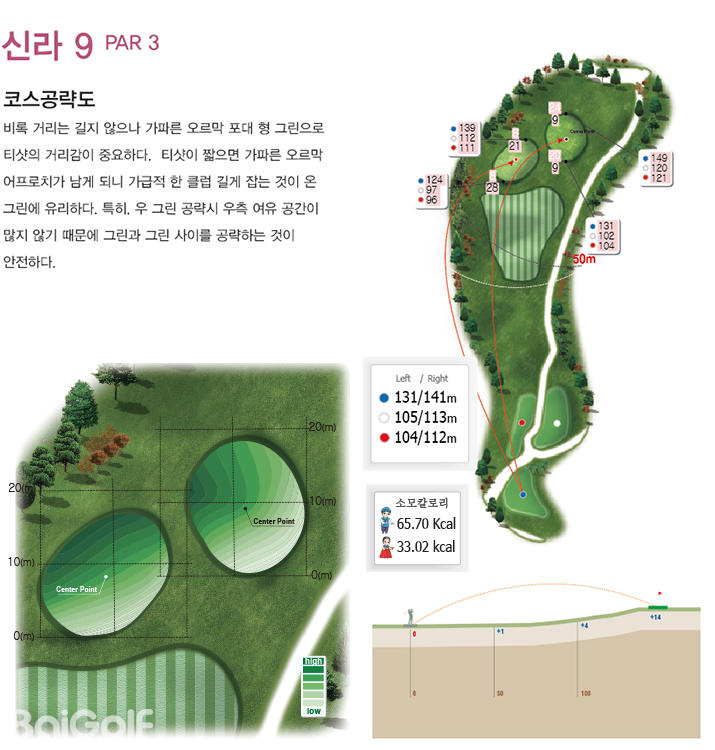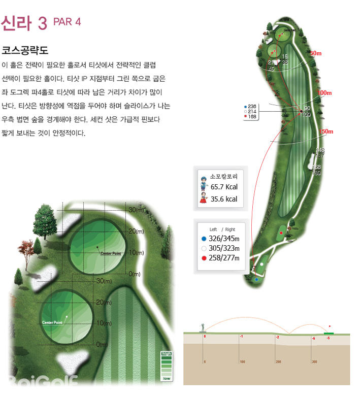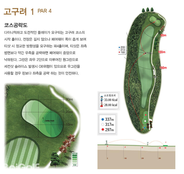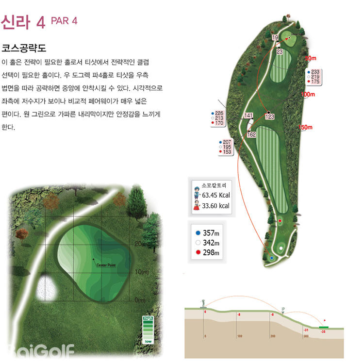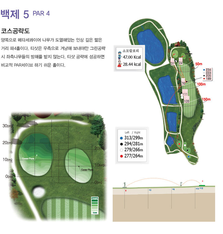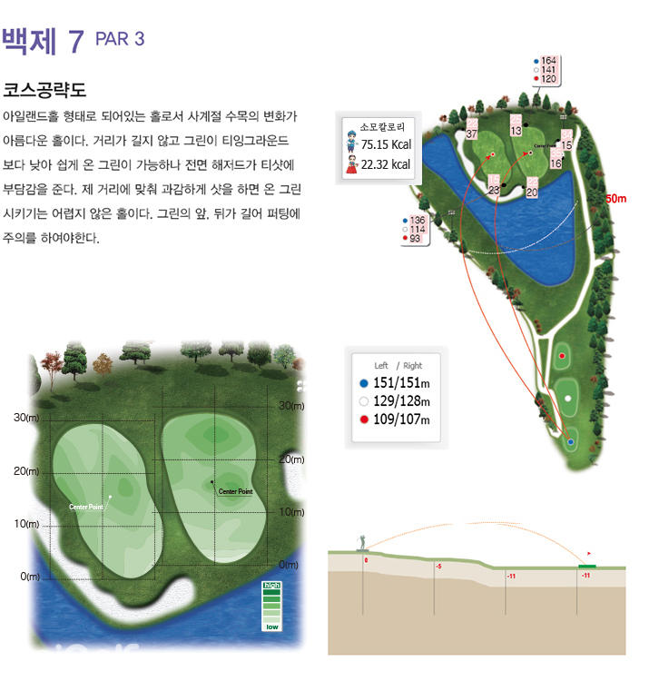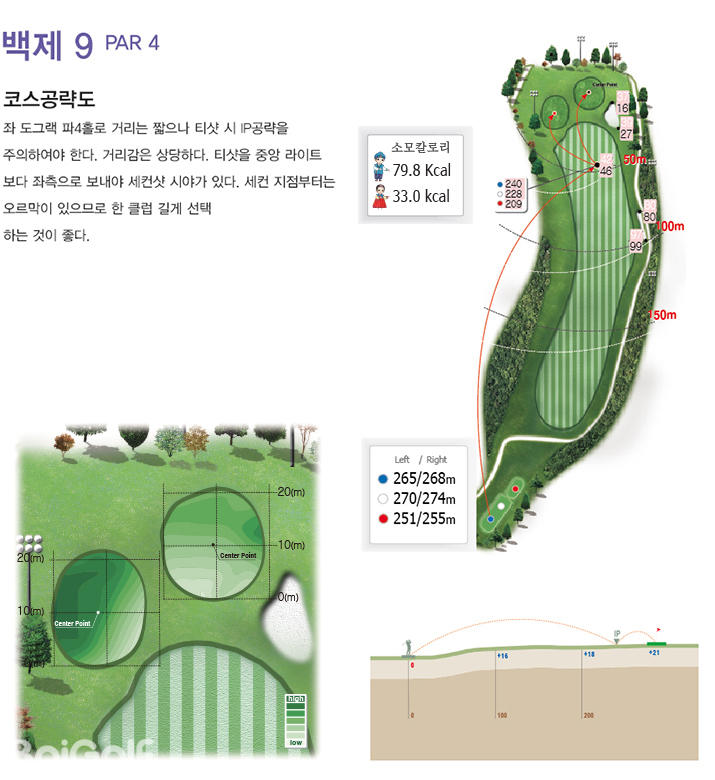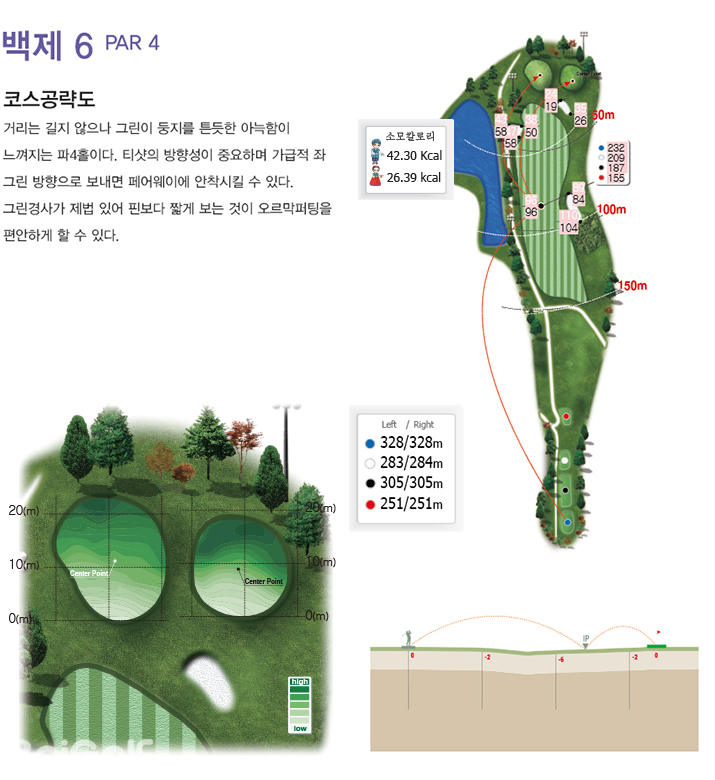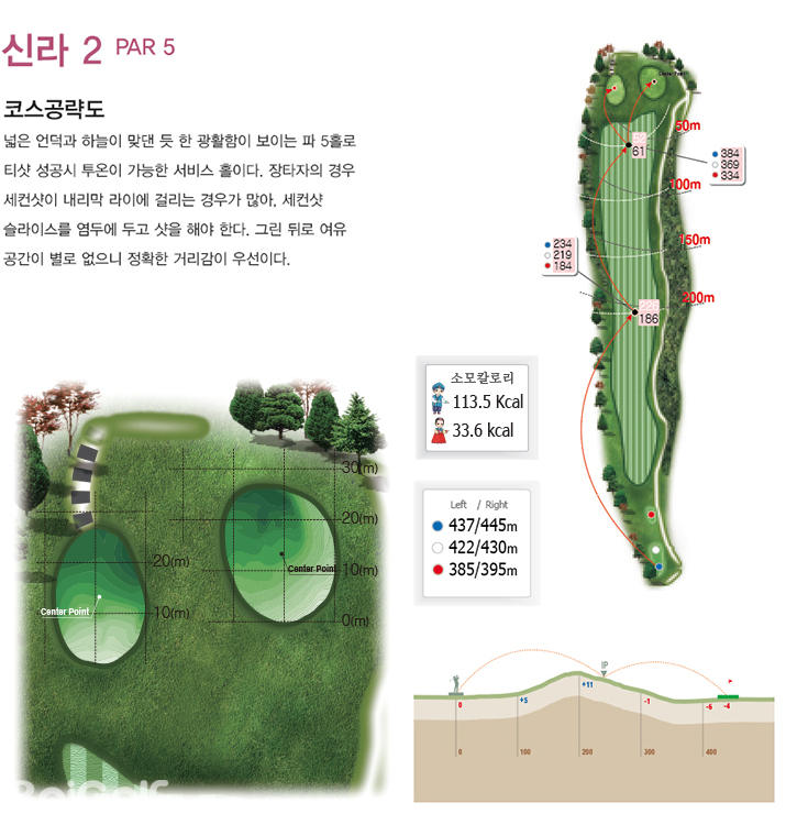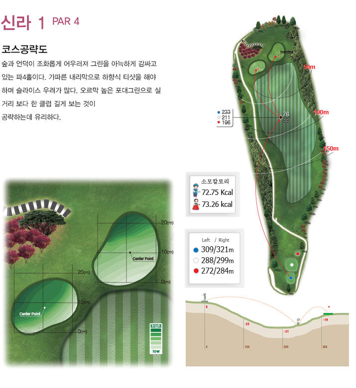 球场适合各个水平的高尔夫球手进行挑战。球场由三个9洞组成,北球场充满活力,球道宽阔,许多球洞都有树木和水障碍,布置得非常漂亮。南球场是一座设计相对温柔而女性化的球场,球道宽阔,起伏不定,激发百高球友的挑战欲望。东球场的许多球洞从发球台看不到果岭,需要精确而细腻的击球,才能获得满意的分数。