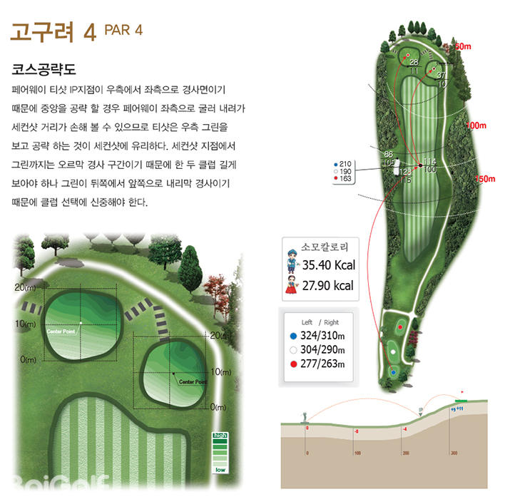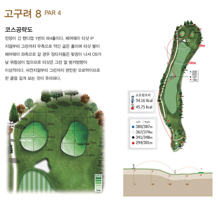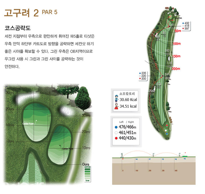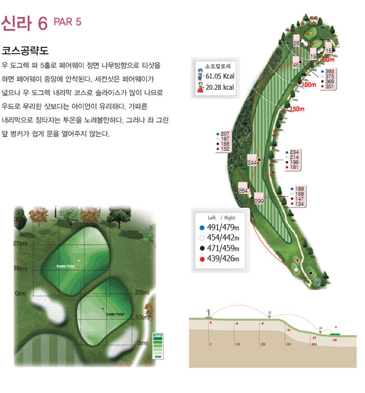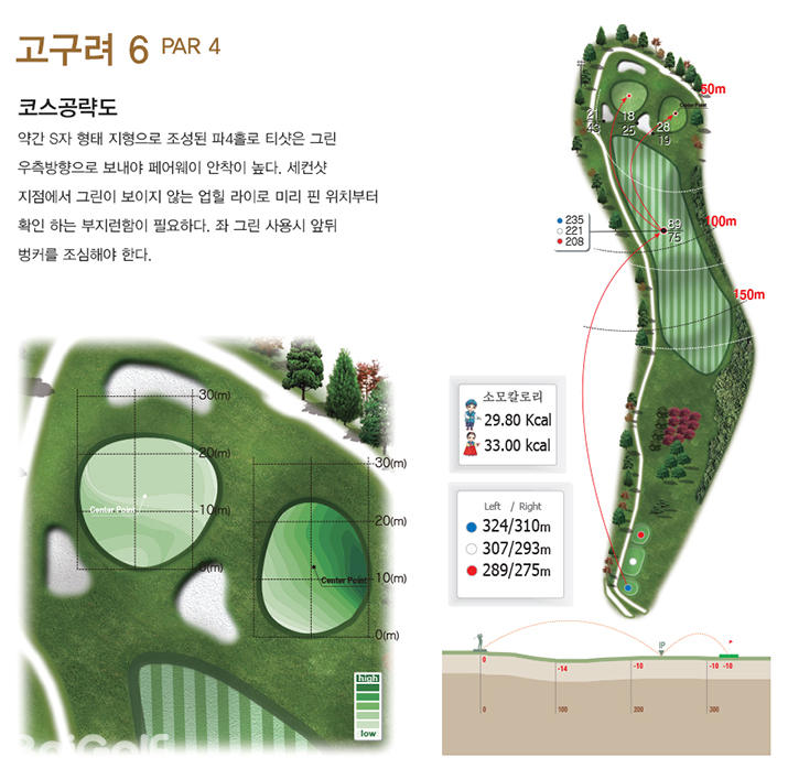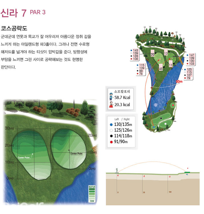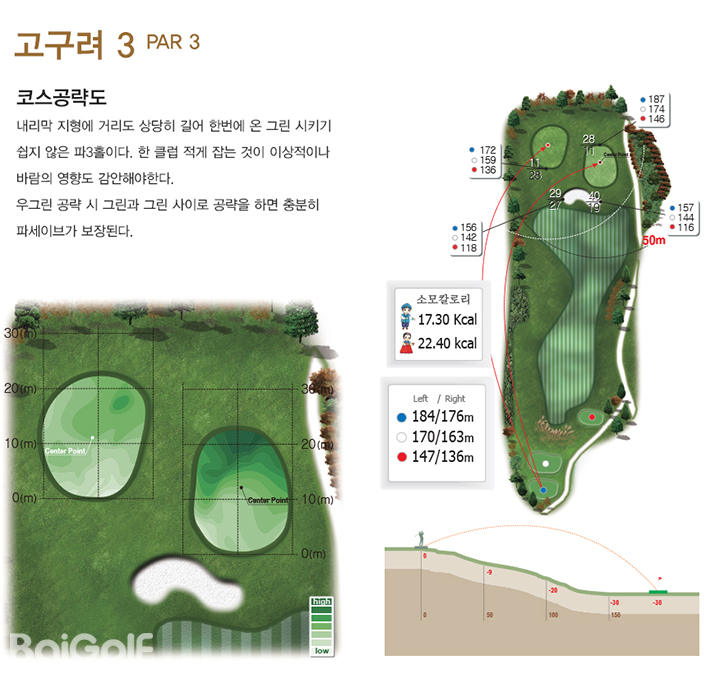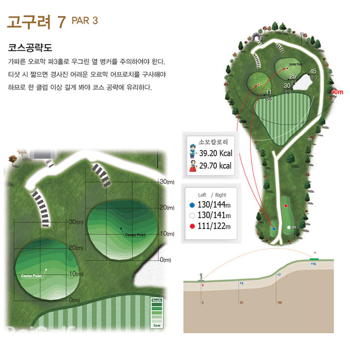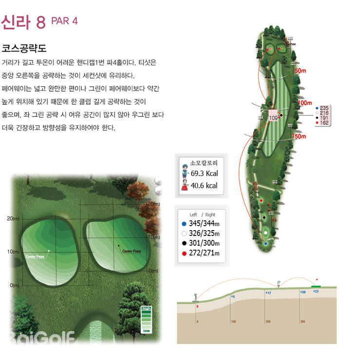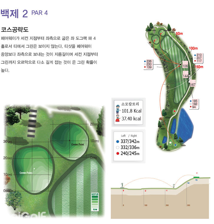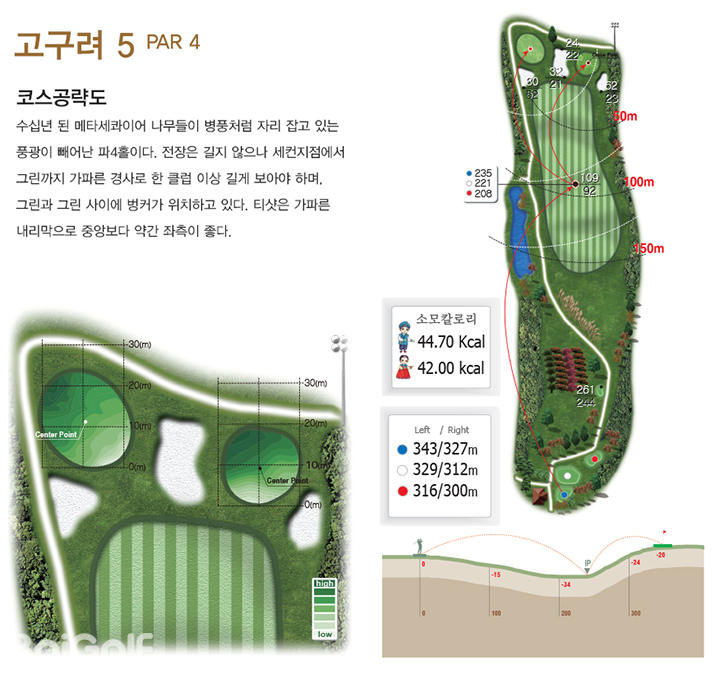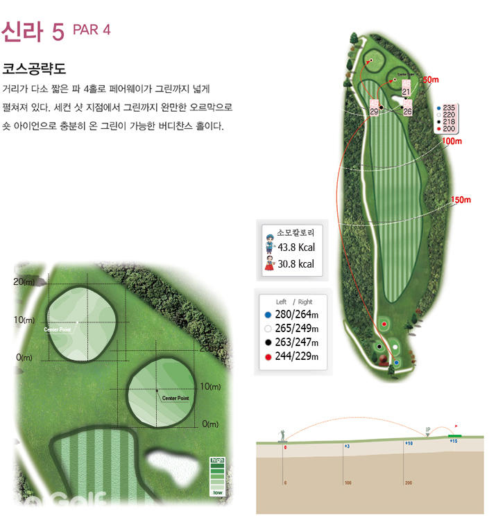 球场适合各个水平的高尔夫球手进行挑战。球场由三个9洞组成,北球场充满活力,球道宽阔,许多球洞都有树木和水障碍,布置得非常漂亮。南球场是一座设计相对温柔而女性化的球场,球道宽阔,起伏不定,激发百高球友的挑战欲望。东球场的许多球洞从发球台看不到果岭,需要精确而细腻的击球,才能获得满意的分数。