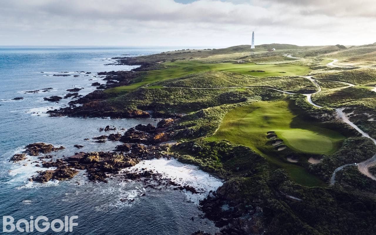 球场上的每个球洞都能看到海景,这非常罕见,而且每个球洞都不一样。起伏的球场通常打起来很稳固,让想象力尽情发挥,带来无限的击球可能性。发球台、球道和果岭都种有羊茅草,效仿了苏格兰和爱尔兰古老的传统林克斯球场。前五个洞绕着法威尔角岬角蜿蜒前行,然后路线向内陆移动,接下来的八个洞位于沙丘和偶尔出现的石灰岩露头之间。然后,第 14 至 18 个洞向雄伟的威克姆角灯塔移动,最后到达一个环绕维多利亚湾的闭洞。