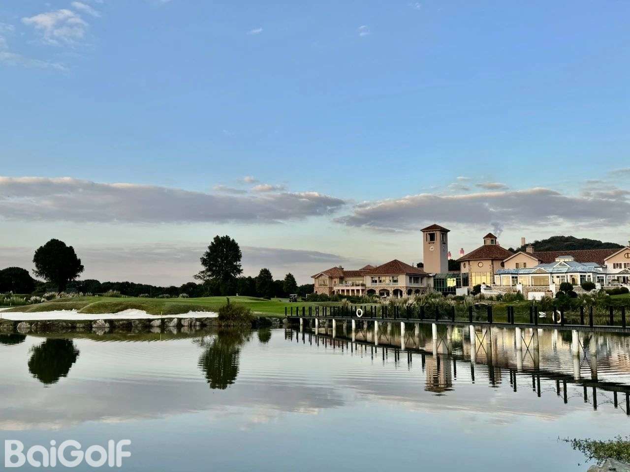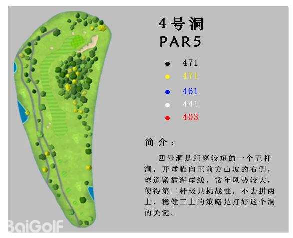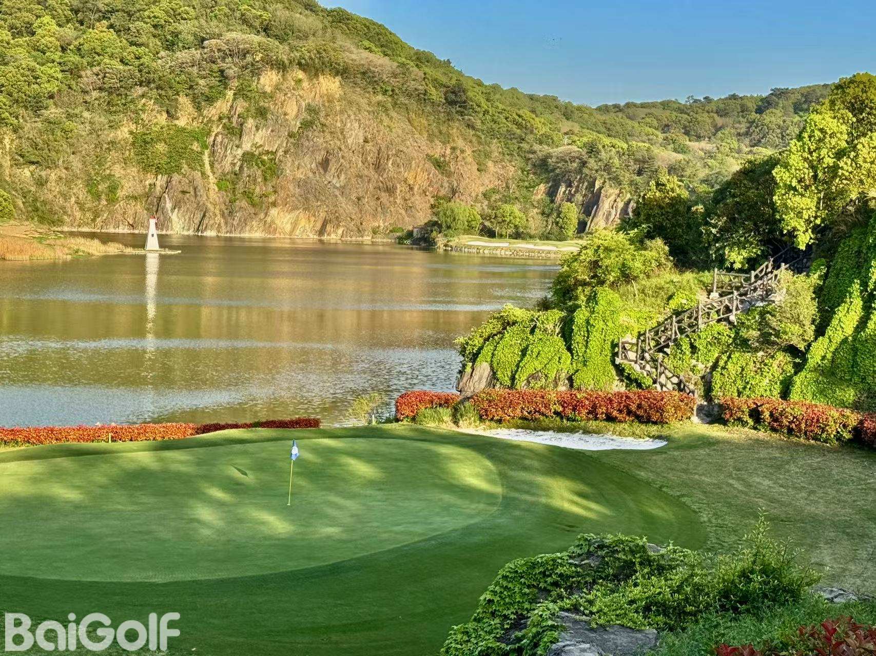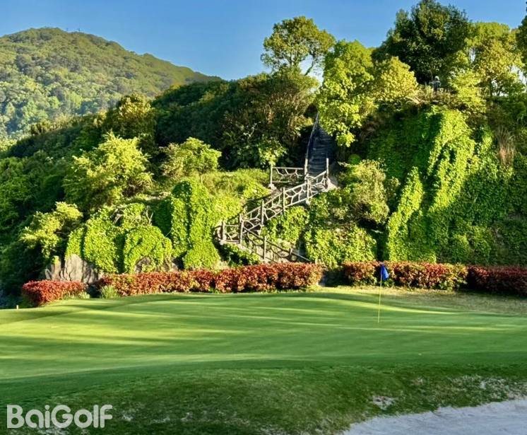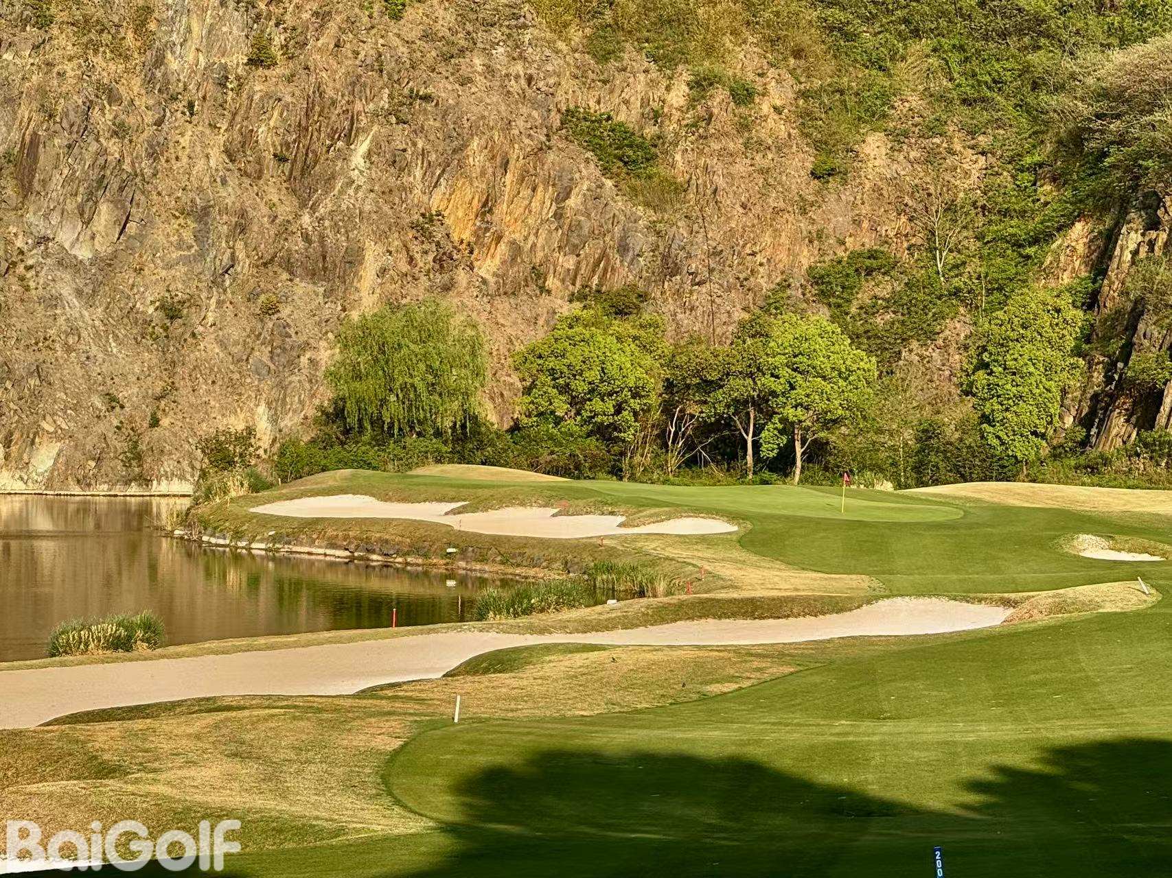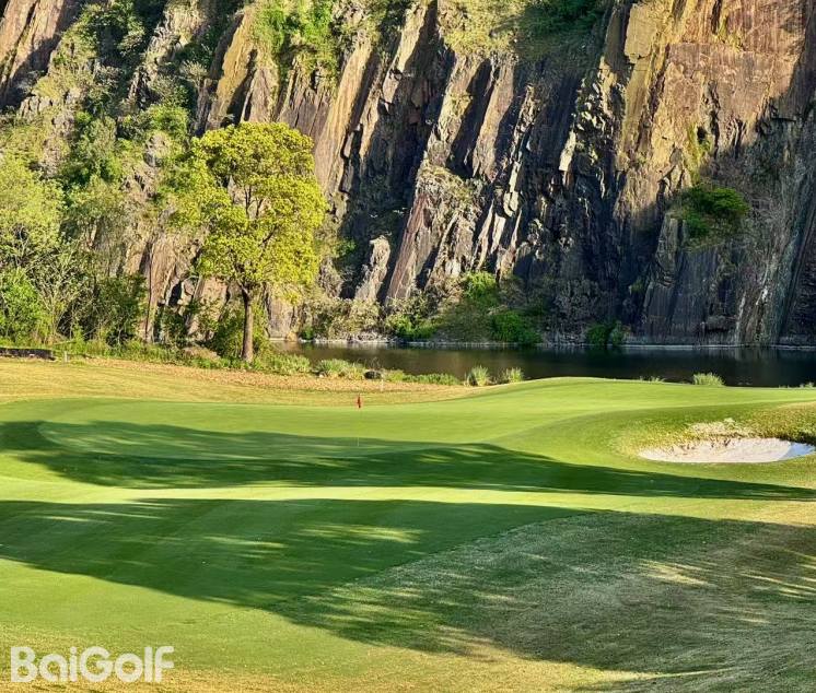 由美国排名前三位的著名高尔夫设计师RONGARL 亲自设计。球场优势:6座山镶嵌,峡谷造就落差30米、海拔150米高难度、大景观球道。3A发球台建立在山顶之上,临峰望海,风景极佳。7C果岭起伏比较大,前后较低,中间较高,落差有十几米,是整个球道中地理位置最好的球道。5C球道的尽头就是个天然的采石坑,气势宏伟,且果岭后的10码处是水障碍,要小心应对,防止球面临着下水的危险。