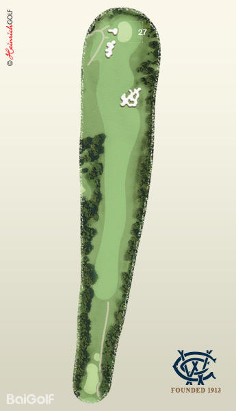 同样令人印象深刻的是,标准杆 5 杆的第 15 洞被汤姆·多克评为世界上最好的标准杆 5 杆洞之一。从后发球台开始,这个洞就非常难打,但在这个洞打出标准杆是一个好成绩,因为从发球台到果岭都充满危险。一组可怕的横向沙坑横跨球道,距离果岭约 100 米,越过这些沙坑后,左侧是深果岭沙坑保护的高架果岭,右侧和后面是陡坡。