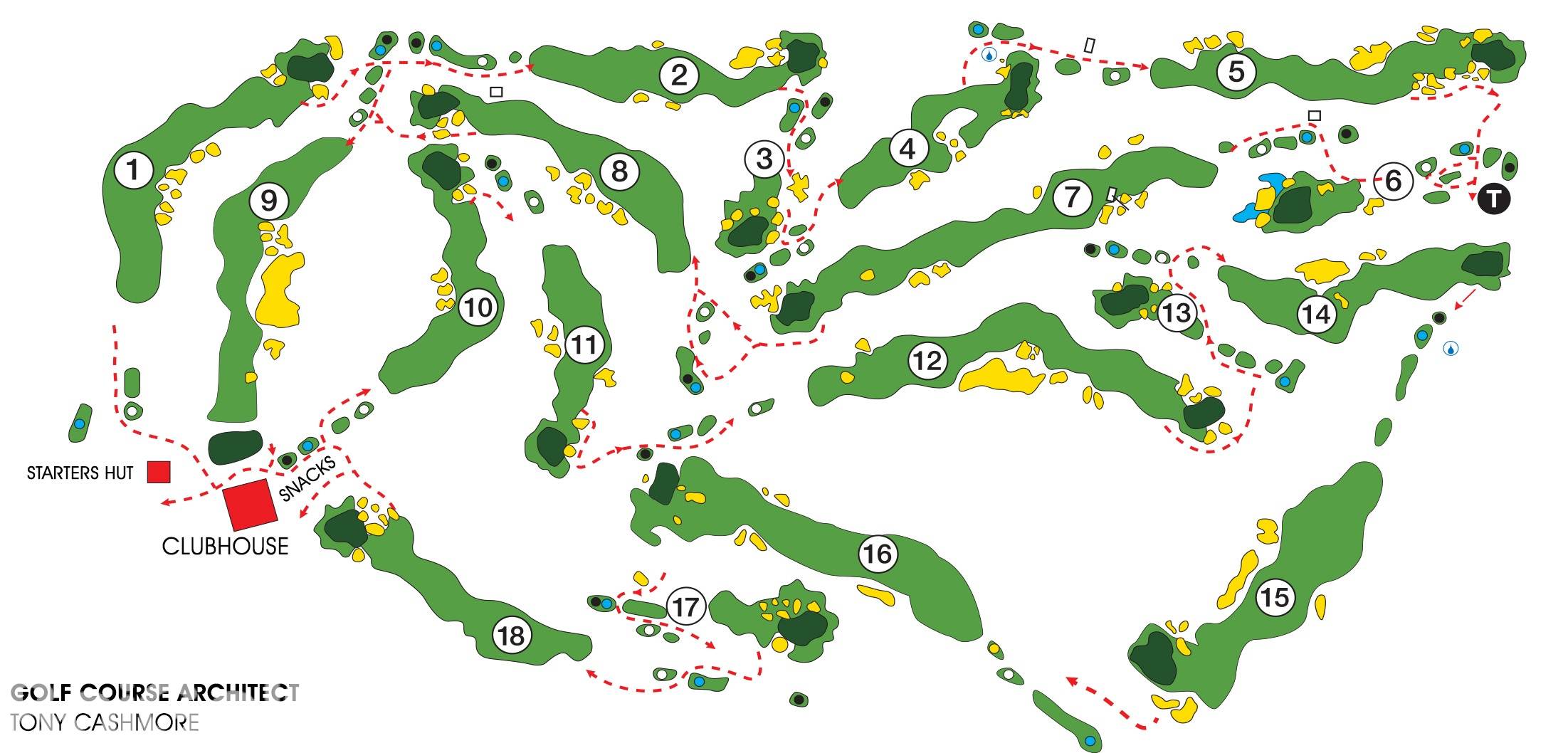 球场的两个九洞呈同心顺时针环状,因此,打球时风向变化很大。球场的重点在于新颖性和变化性,因此要求高尔夫球手进行多次方向变化,应对山坡上的球位,并向山顶果岭开球。