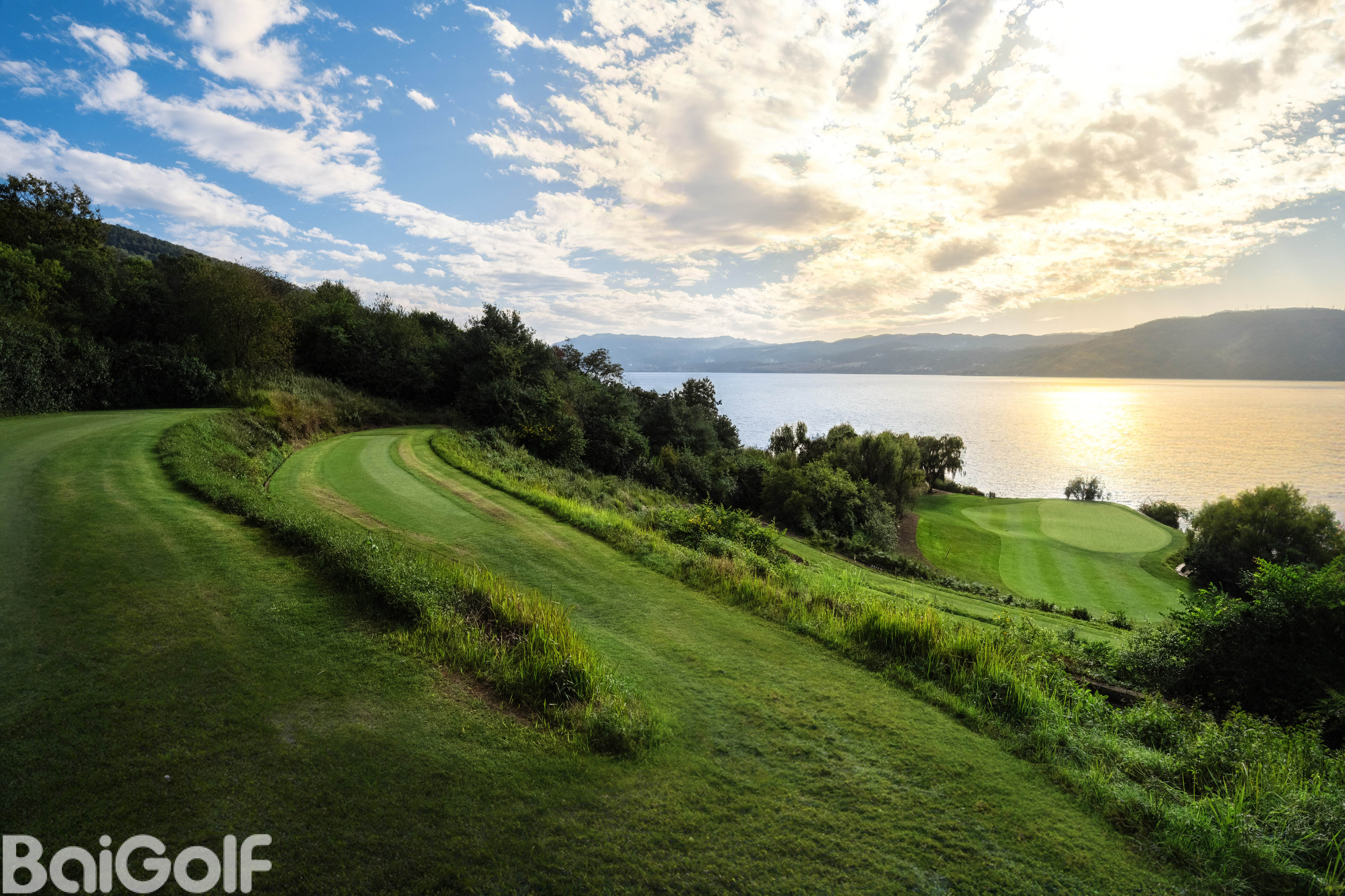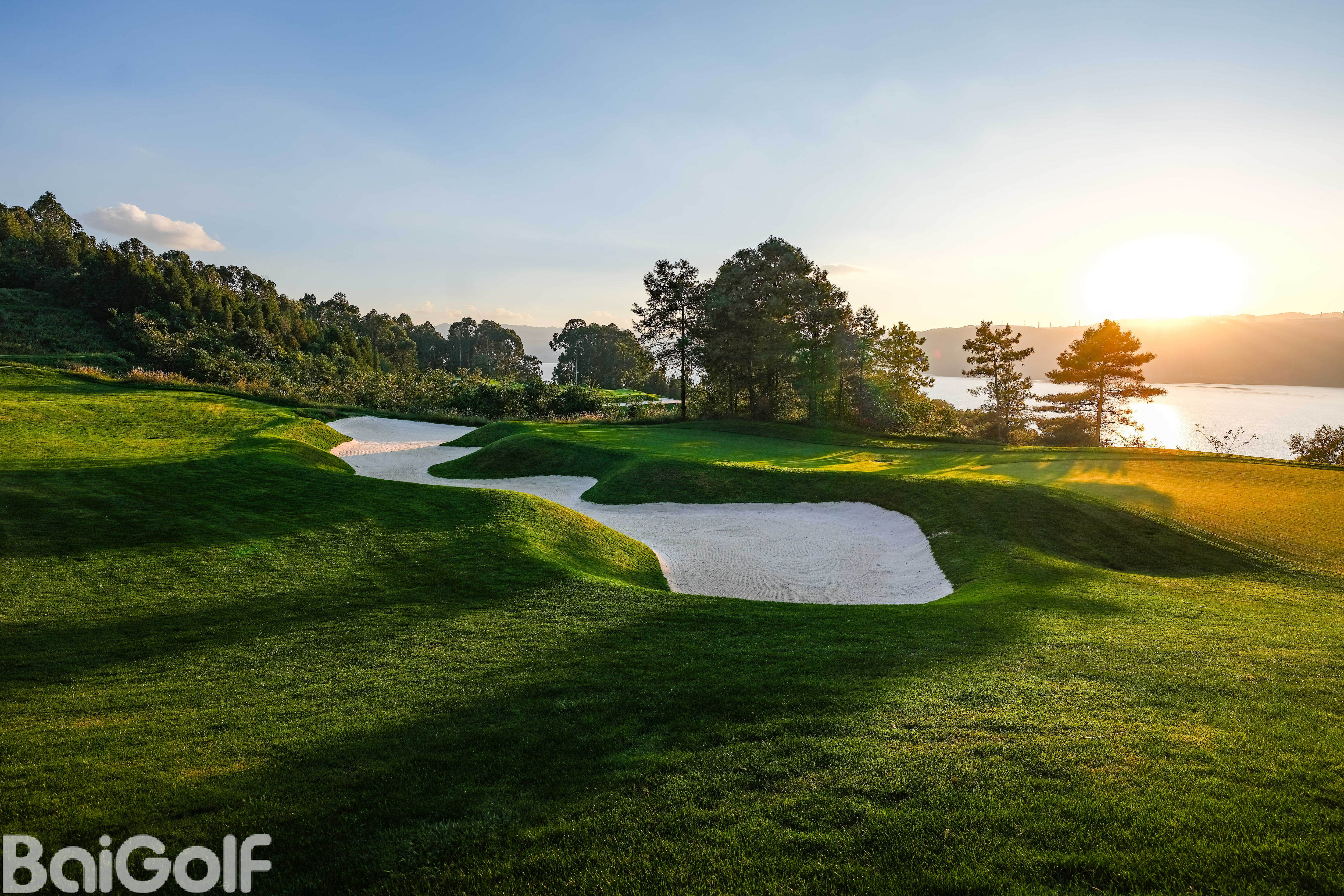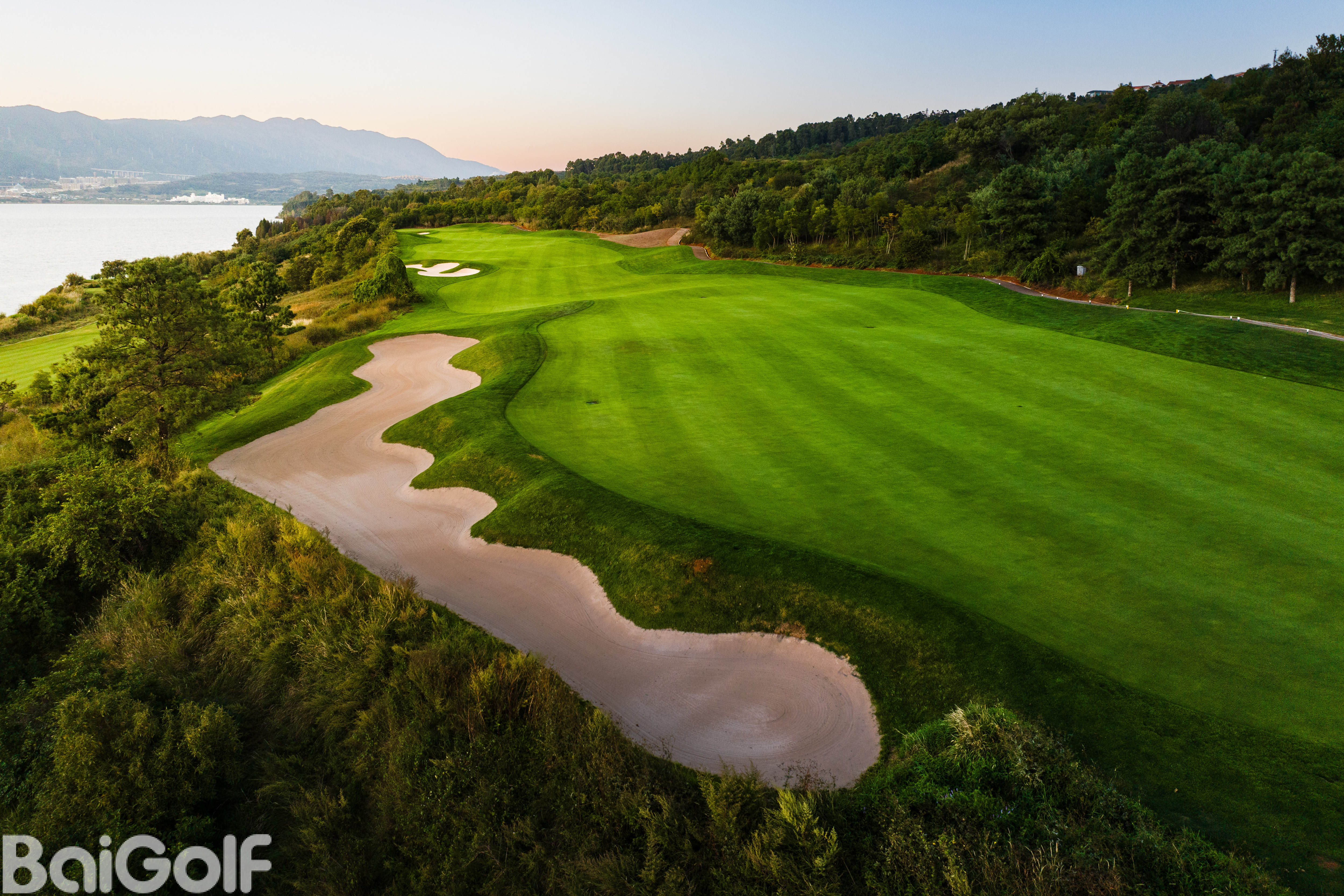18洞湖景球场,环绕于阳宗海湖畔,以其球道狭窄、沟壑纵横、湖风强劲、梯田状果岭,以及优美的水岸风光闻名于世。半山一号洞至湖畔九号洞的150码落差,梯田式亲水美景与高跨度击球挑战并存;18个精美球洞,洞洞依山面湖,大气磅礴,坐拥湖光山色,尽览天地壮阔;18处精致果岭,移位换景,球位不同,进攻策略迥异;湖面西风强劲,全场沟壑纵横,加之小罗伯特•琼斯典型模式击球的准确度要求,令每位球手倍感挑战,流连忘返。