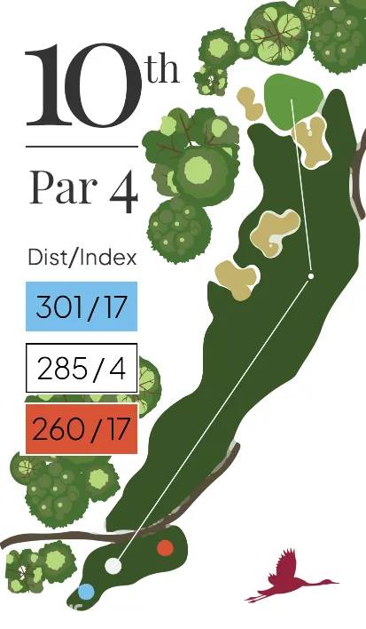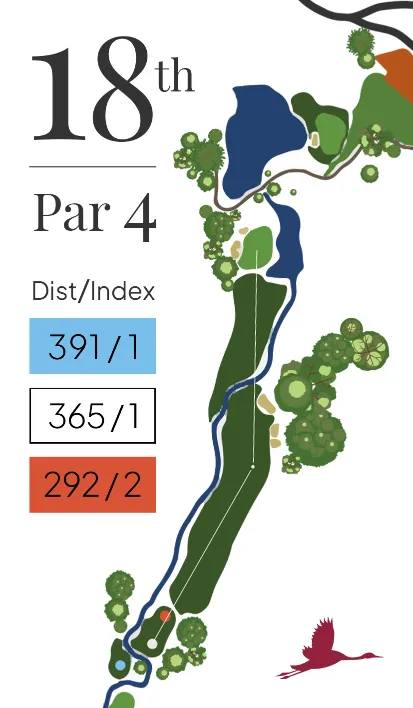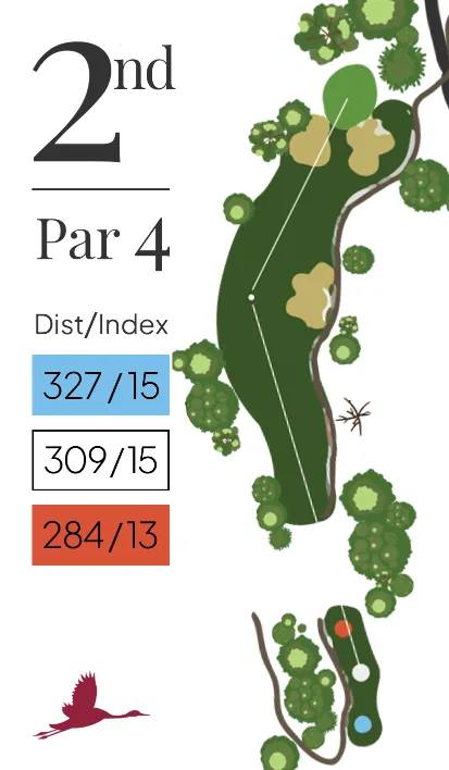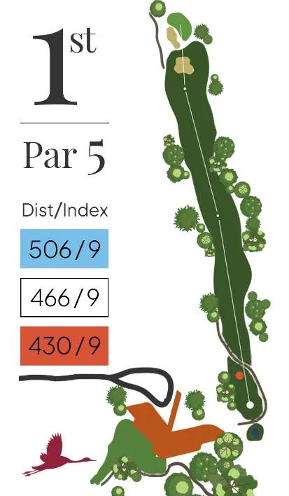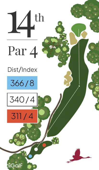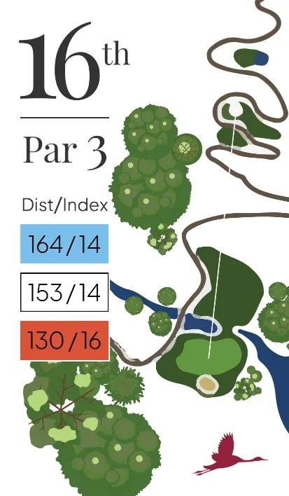 球场的五杆洞1号洞开局艰难,球道右侧距离果岭165码的一棵大树占据了球场的主导地位。前九洞以惊险刺激的下坡四杆洞结束,通往果岭的球道必须经过一个湖泊,湖泊保护着推杆表面。后九洞的第16洞——据说球场的设计围绕着这个球洞——是一个精彩的三杆洞,从发球台俯瞰,果岭的落差接近200英尺,位于池塘后面。