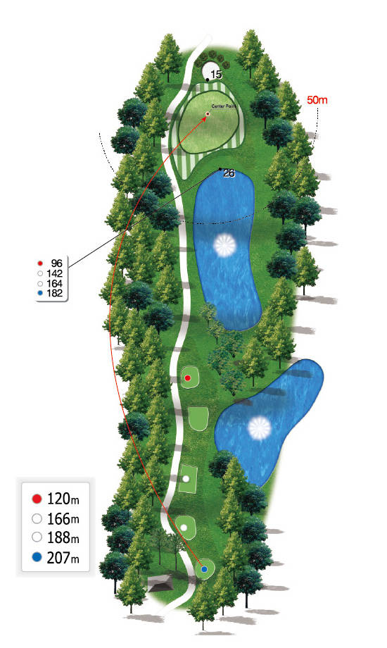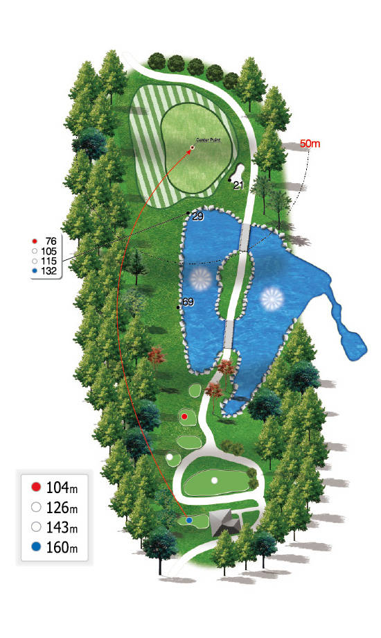 玫瑰球场:依偎在茂密松林旁的独立球洞,在静谧的环境中专注挥杆。清爽的水障碍和优美的天桥与周围景色和谐相融,倍感放松。