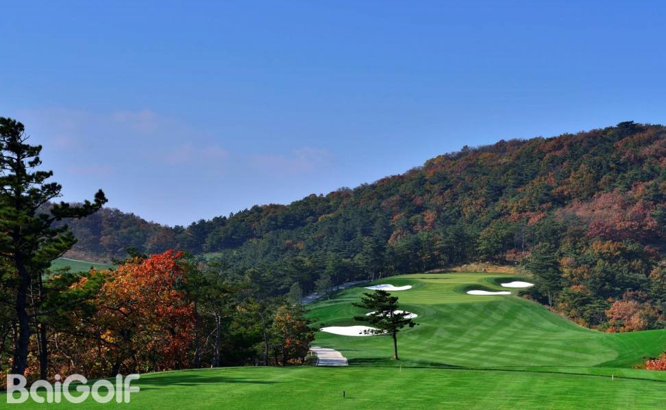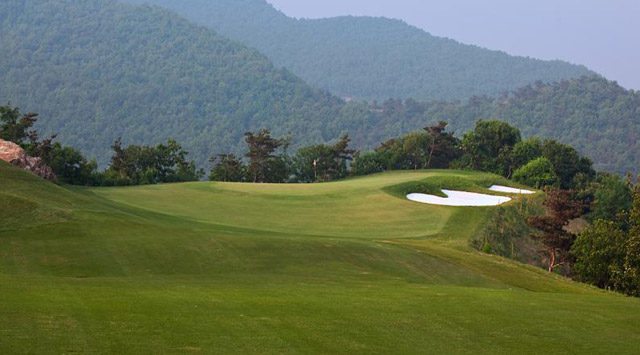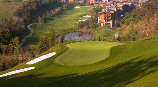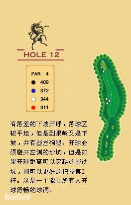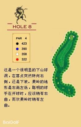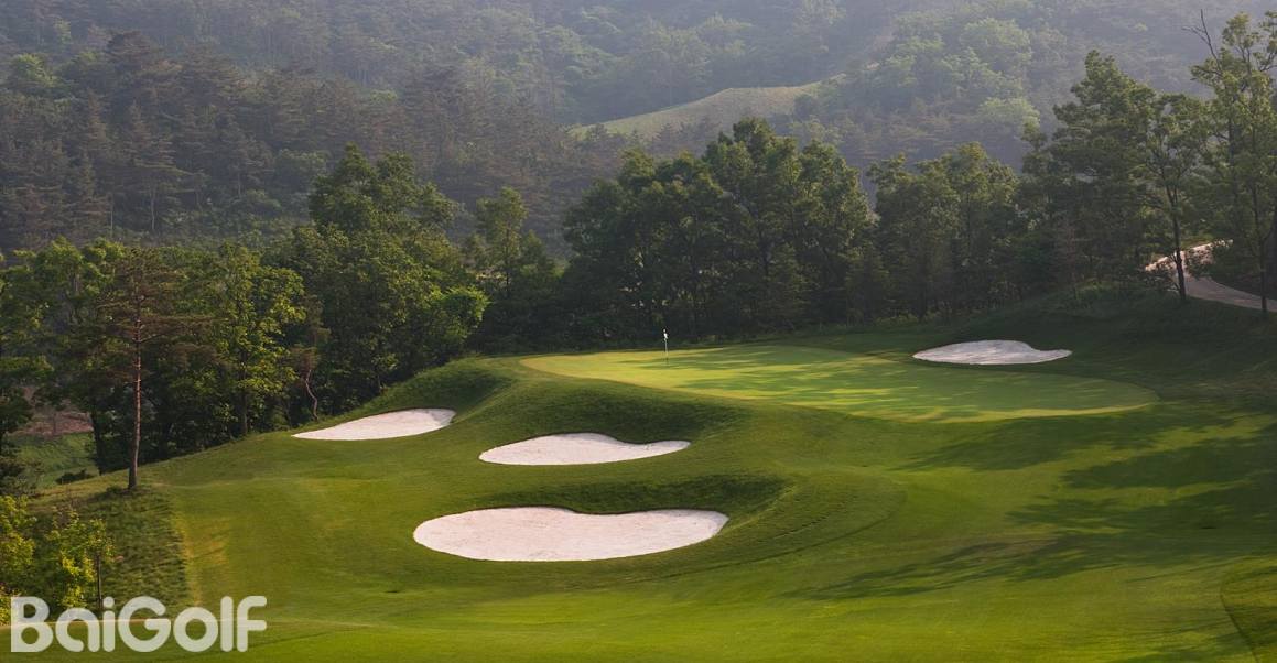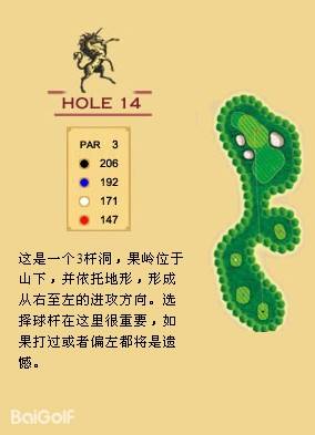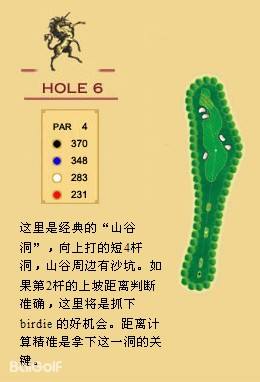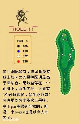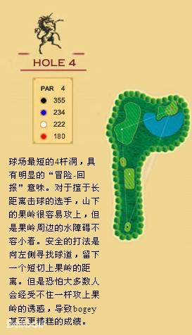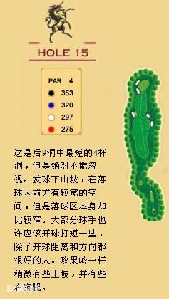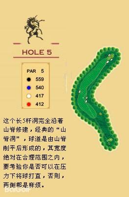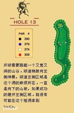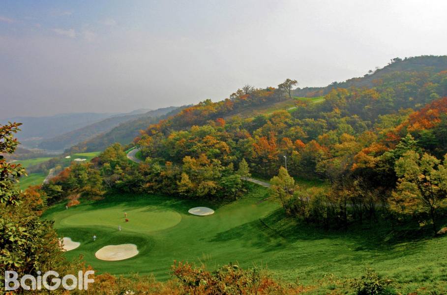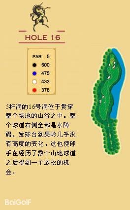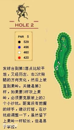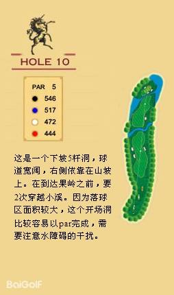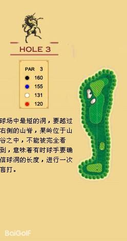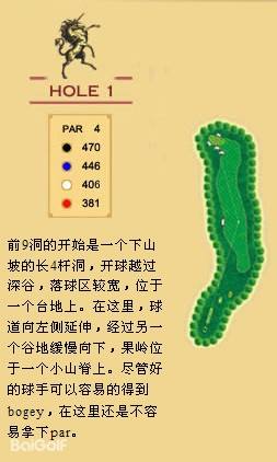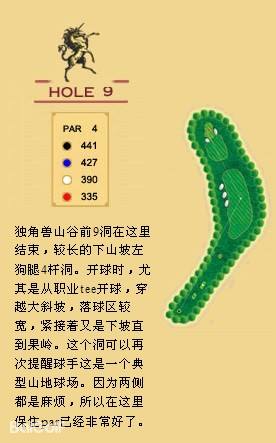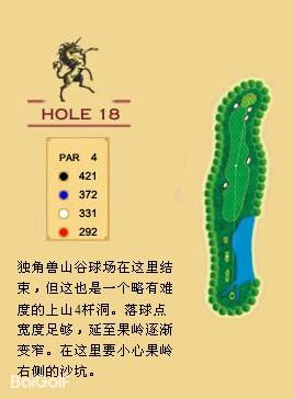 独角兽是红旗谷最早开放的18洞。前两洞自东向西延伸,开局是个全长470码的四杆洞,开球越过深谷,落球区也较宽。两杆面向下坡地势的击球之后,才会到达有4个沙坑守护的果岭。作为开场洞,它并不简单。蓝Tee长480码的2号洞相对更让人体会到球场开局的友好。独角兽前场中段的这几洞是整个球场的亮点,高反差的地势、频频的障碍,一旦失误便无法挽回;独角兽的后九洞布局在球场西南一侧,相对前九洞更加紧凑,起伏也相对小一些,但挑战依旧。