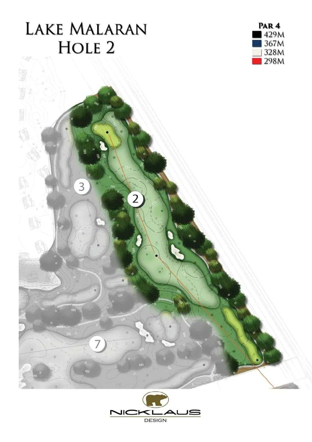 “尼克劳斯球场”被设计成一个草木开阔的乡村风景型球场,拥有一大片修建整齐的草皮,一排排林立于球道边上的树和精心打理的沙坑。这个球场的码数和名人赛球场比起来稍微短一些,因此平均水平的球员可以享受每一轮打球过程,而初学者、青少年球手和高龄球手在打球时不会因球场难度和挑战性有过多压力。