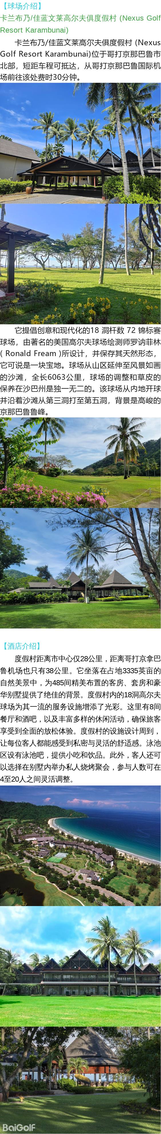抵达马来西亚沙巴,到酒店办理入住,然后前往卡兰布乃/佳蓝文莱高尔夫俱度假村 (Nexus Golf Resort Karambunai)挥杆18洞。