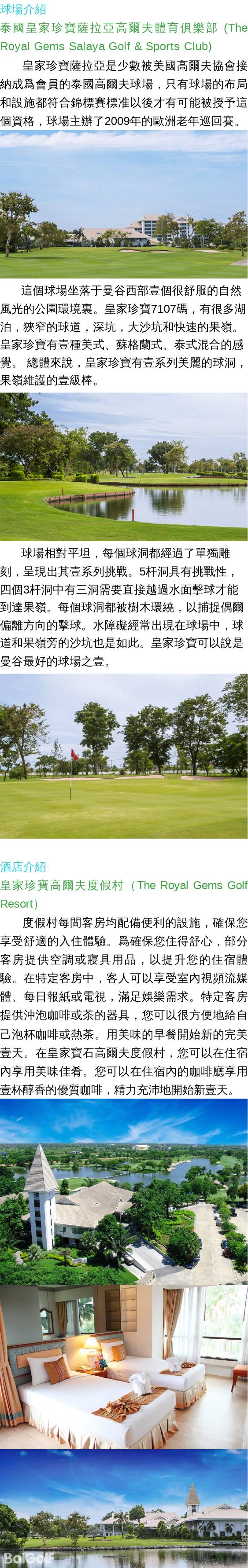 抵達後到酒店辦理入住,然後前往泰國皇家珍寶薩拉亞高爾夫體育俱樂部 (The Royal Gems Salaya Golf & Sports Club)揮杆18洞。