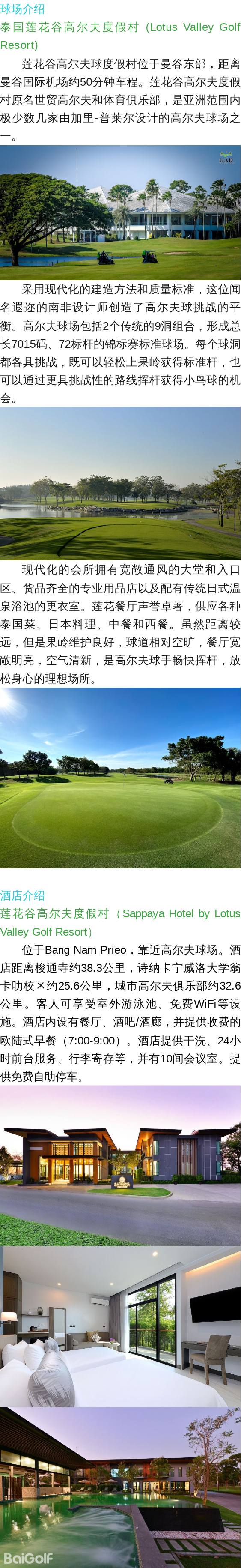 抵达后到酒店办理入住,然后前往泰国莲花谷高尔夫度假村 (Lotus Valley Golf Resort)挥杆18洞。