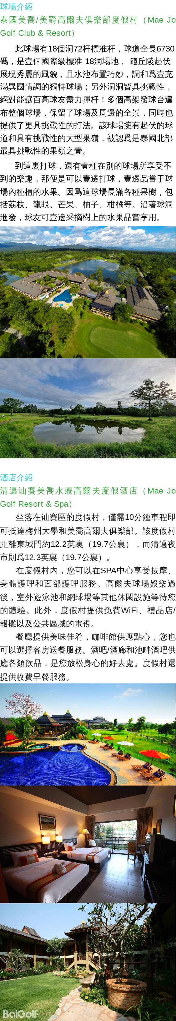 抵達後到酒店辦理入住,然後前往泰國美喬/美爵高爾夫俱樂部度假村(Mae Jo Golf Club & Resort)揮杆18洞。