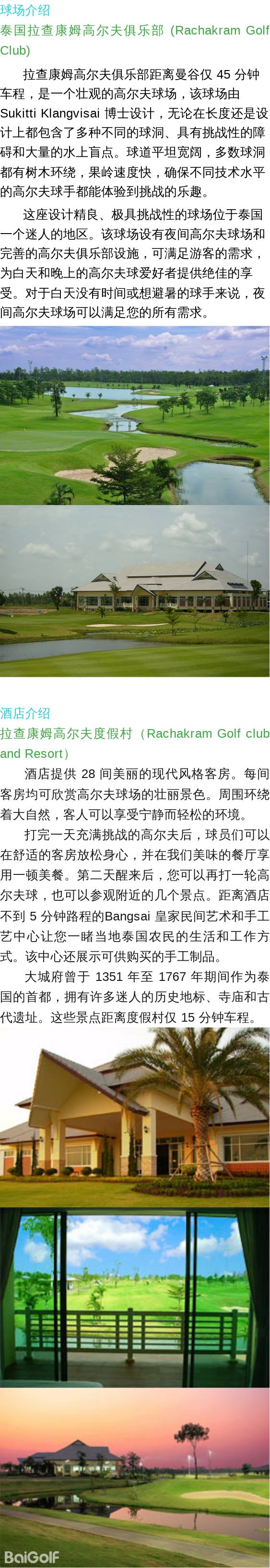 抵达后到酒店办理入住,然后前往泰国拉查康姆高尔夫俱乐部 (Rachakram Golf Club)挥杆18洞。
