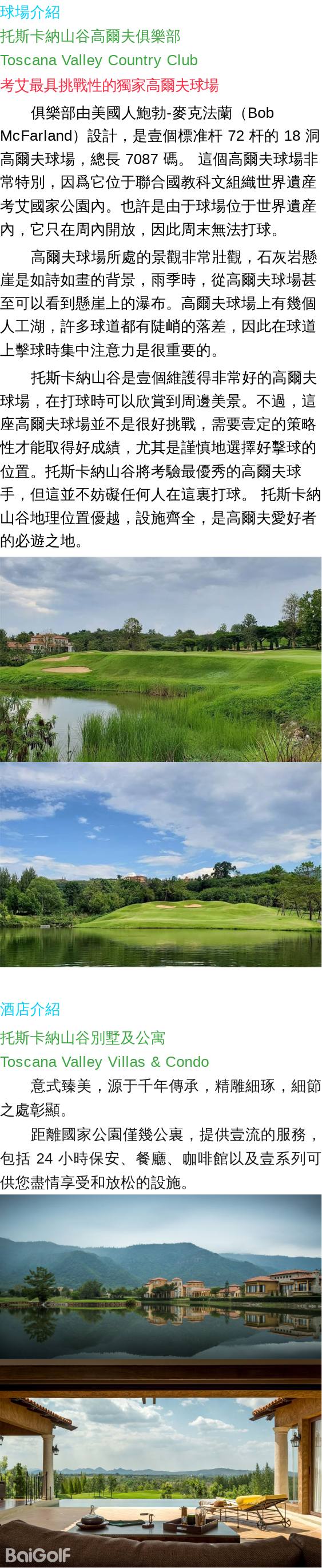 抵達後到酒店辦理入住,然後前往托斯卡納山谷高爾夫俱樂部(Toscana Valley Country Club)揮杆18洞。