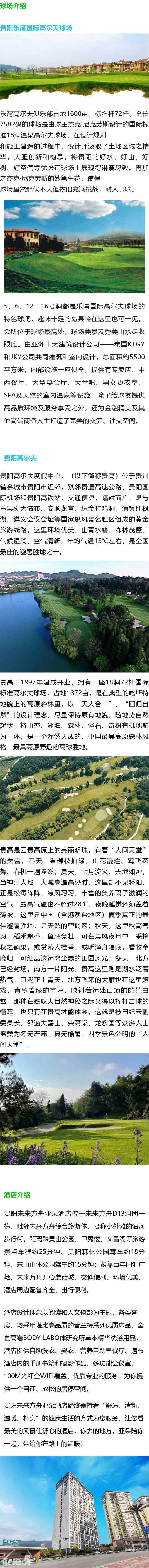 贵阳高尔夫度假中心坐落在贵阳市近郊,紧邻贵遵高速公路,环境幽深宁静, 地势平缓起伏,林木茂盛,空气清新,湖水清澈,自然风景秀丽迷人,毗邻著名的阳明洞,为全国唯 一的高原森林高尔夫球场,拥有贵州省唯一的18洞72杆国际标准高尔夫球场两座,备有完善的配套设 施,提供优质高档的服务国内外嘉宾到此以球会友,洽谈生意,休闲度假,娱乐健身,无不交口称赞。